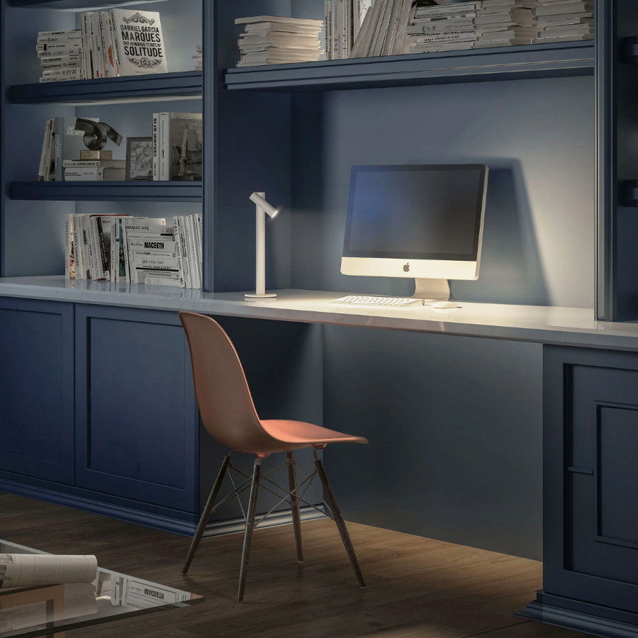 Dit model heeft een 12cm lange buisvormige lampenkap. Deze is 360 graden draaibaar en afneembaar door middel van een magneet. Aan de achterzijde van de buis zit een touch knop voor aan/uit en traploos dimmen.