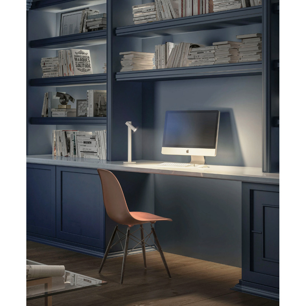 Dit model heeft een 12cm lange buisvormige lampenkap. Deze is 360 graden draaibaar en afneembaar door middel van een magneet. Aan de achterzijde van de buis zit een touch knop voor aan/uit en traploos dimmen.