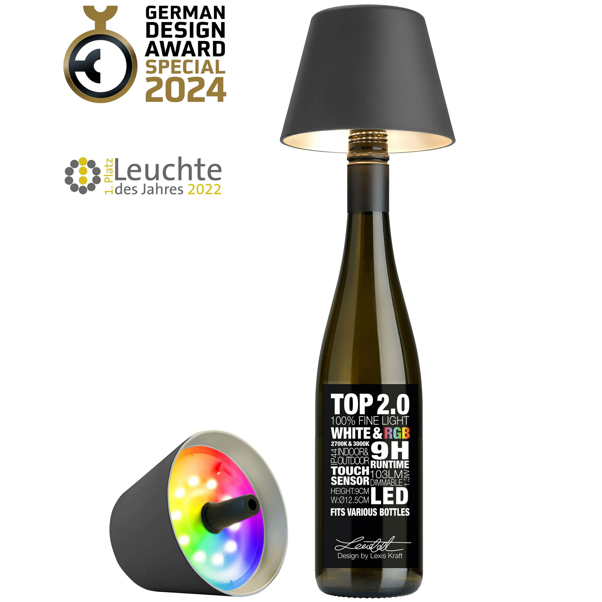 Werp jouw mooiste fles niet in de glasbak, maar tover hem om in een bijzonder lichtobject. Kun je geen afscheid nemen van jouw unieke whiskyfles of heb je nog steeds goede herinneringen aan twee lege bierflesjes, recycle ze dan samen met de TOP 2.0 flessenlamp van Sompex tot een volwaardige, oplaadbare tafellamp. Zijn conisch gevormde siliconen kurk past in vrijwel alle flessenhalzen. Kies uit het ruime aanbod de passende kleur en plaats hem op jouw favoriete fles. Zo creëer je in een handomdraai jouw eigen LED verlichting met unieke look. Persoonlijke lichtkunst door upcycling! TOP 2.0 wordt geleverd in een passende zwarte kartonnen koker voorzien van opdruk.