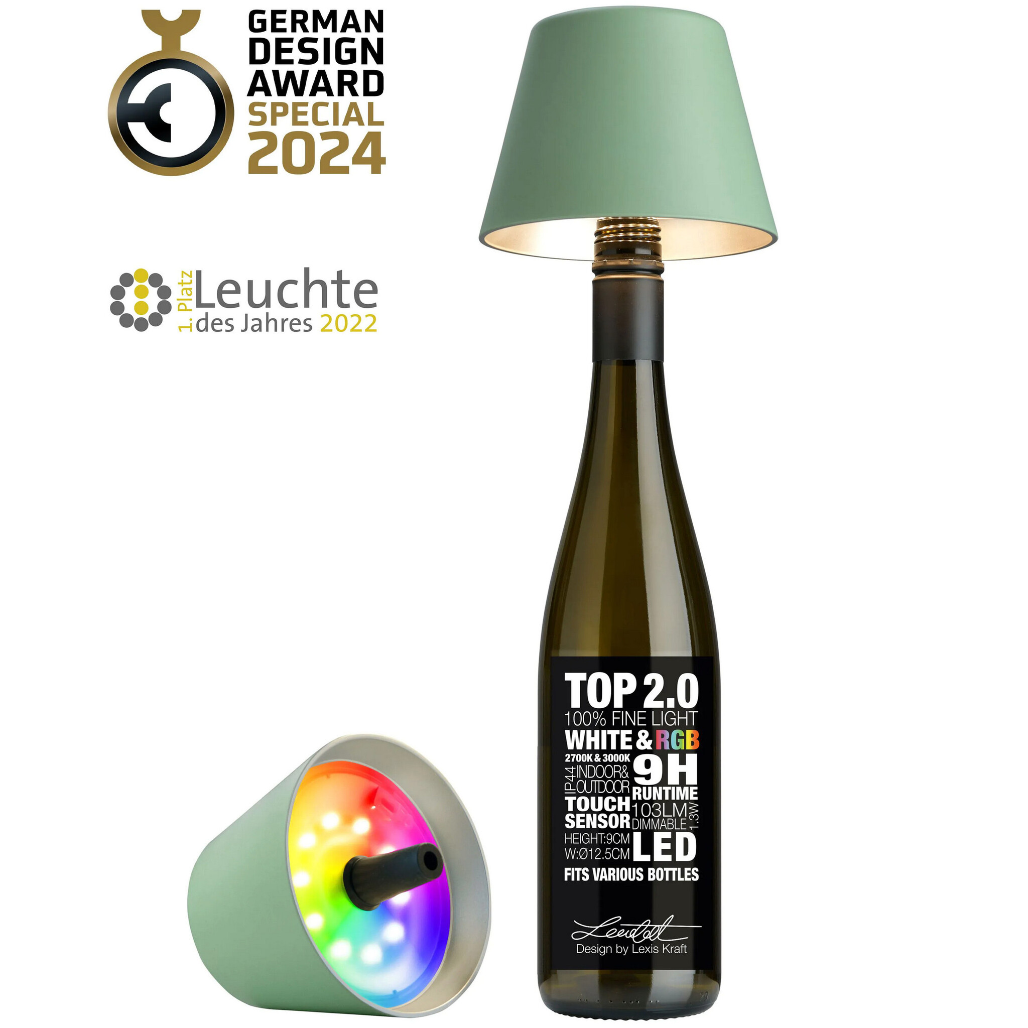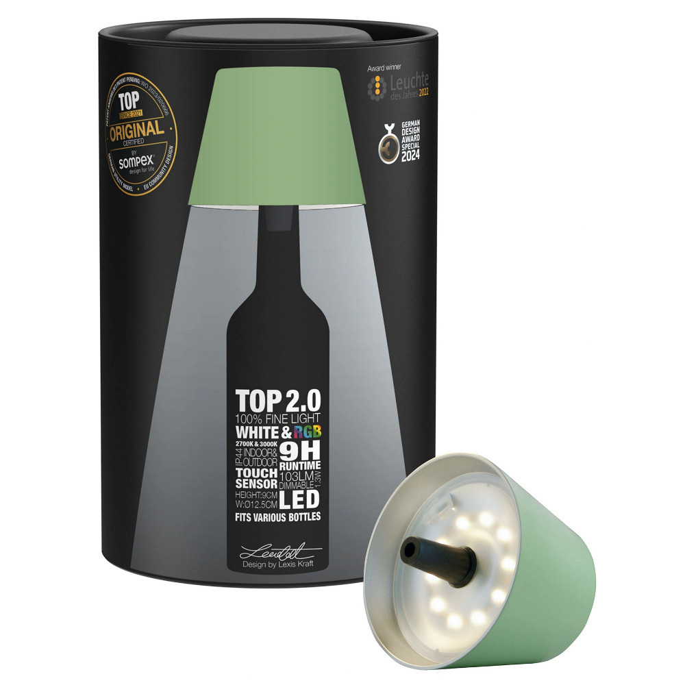 Werp jouw mooiste fles niet in de glasbak, maar tover hem om in een bijzonder lichtobject. Kun je geen afscheid nemen van jouw unieke whiskyfles of heb je nog steeds goede herinneringen aan twee lege bierflesjes, recycle ze dan samen met de TOP 2.0 flessenlamp van Sompex tot een volwaardige, oplaadbare tafellamp. Zijn conisch gevormde siliconen kurk past in vrijwel alle flessenhalzen. Kies uit het ruime aanbod de passende kleur en plaats hem op jouw favoriete fles. Zo creëer je in een handomdraai jouw eigen LED verlichting met unieke look. Persoonlijke lichtkunst door upcycling! TOP 2.0 wordt geleverd in een passende zwarte kartonnen koker voorzien van opdruk.