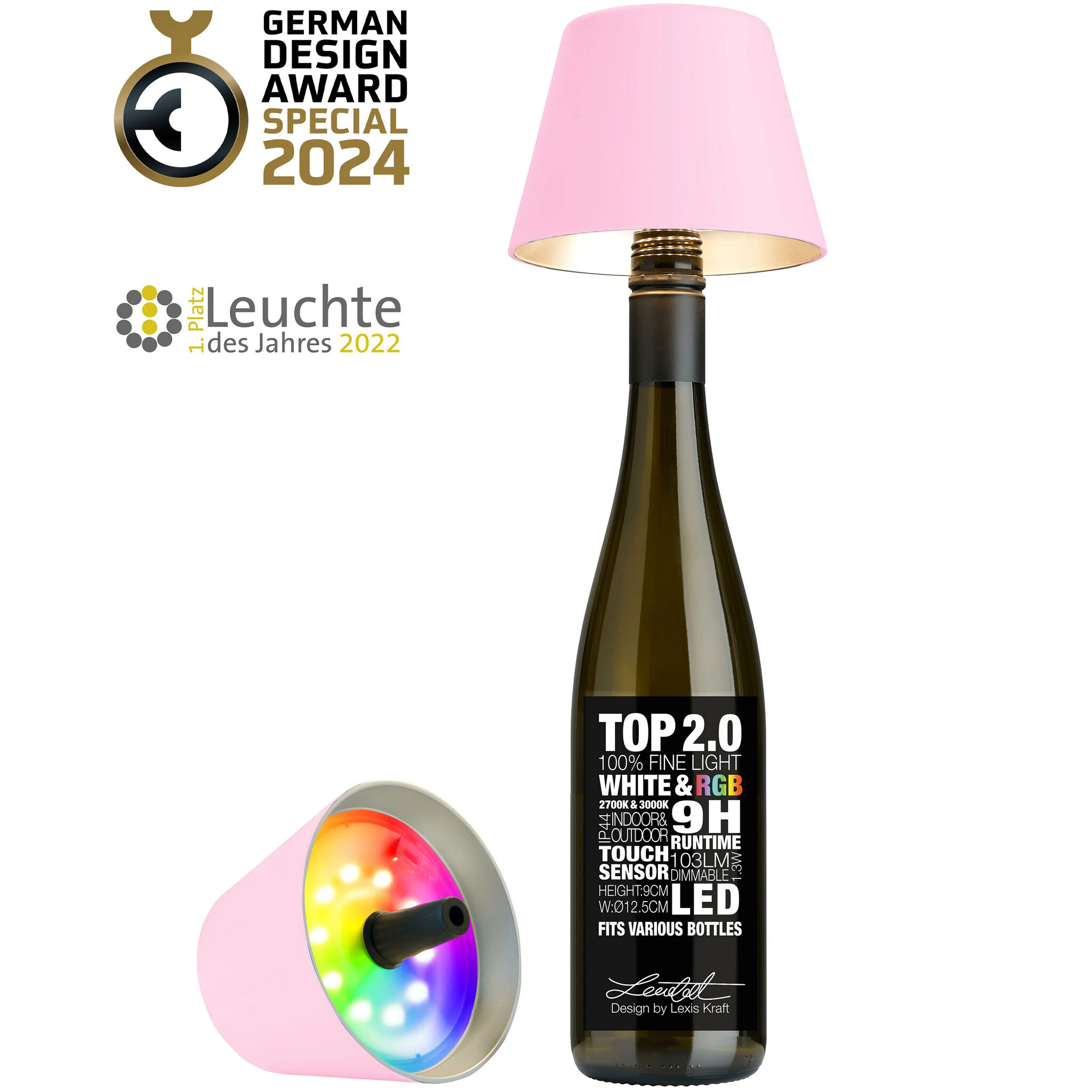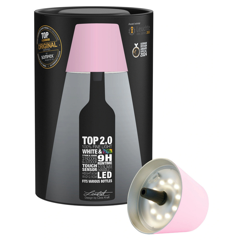 Werp jouw mooiste fles niet in de glasbak, maar tover hem om in een bijzonder lichtobject. Kun je geen afscheid nemen van jouw unieke whiskyfles of heb je nog steeds goede herinneringen aan twee lege bierflesjes, recycle ze dan samen met de TOP 2.0 flessenlamp van Sompex tot een volwaardige, oplaadbare tafellamp. Zijn conisch gevormde siliconen kurk past in vrijwel alle flessenhalzen. Kies uit het ruime aanbod de passende kleur en plaats hem op jouw favoriete fles. Zo creëer je in een handomdraai jouw eigen LED verlichting met unieke look. Persoonlijke lichtkunst door upcycling! TOP 2.0 wordt geleverd in een passende zwarte kartonnen koker voorzien van opdruk.