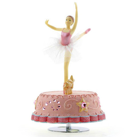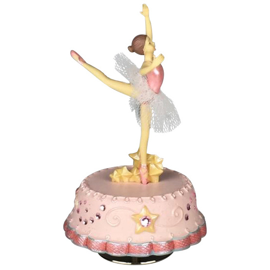 Speeldoos met een dansende ballerina op een fraai gedecoreerd toneel. De ballerina staat in de zogenaamde arabesque houding. Het geheel is gemaakt van polystone, de tutu die de ballerina draagt is van witte kant stof. Na het opwinden van het mechanisme, met de ronde metalen schijf aan de onderzijde, klinkt de melodie en draait het geheel rond.