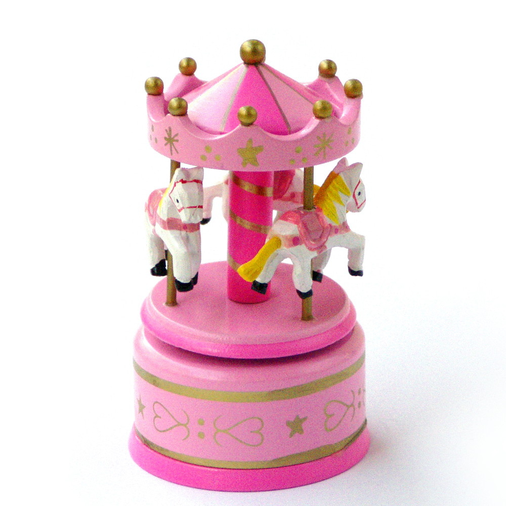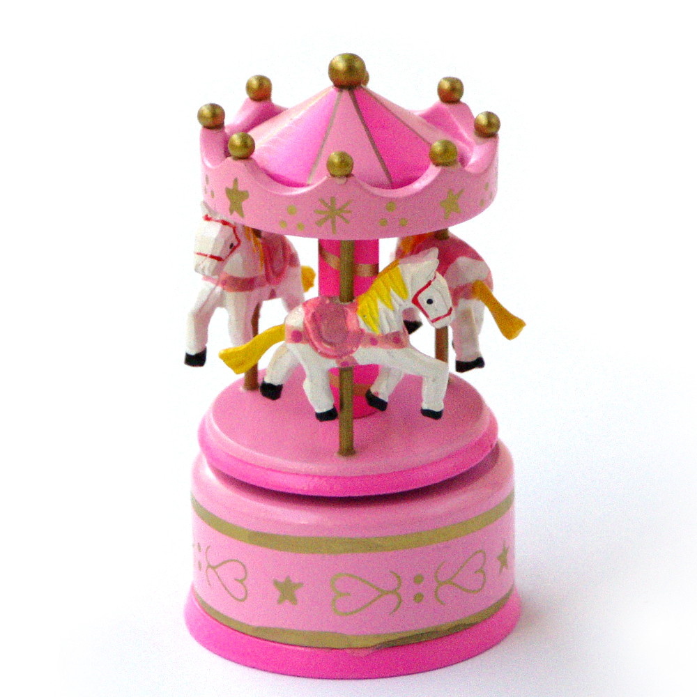 Muziekdoos als traditionele houten draaimolen. Deze trendy gekleurde carrousel heeft drie witte paarden en is verder stijlvol uitgevoerd in twee tinten roze, afgewerkt met goud.