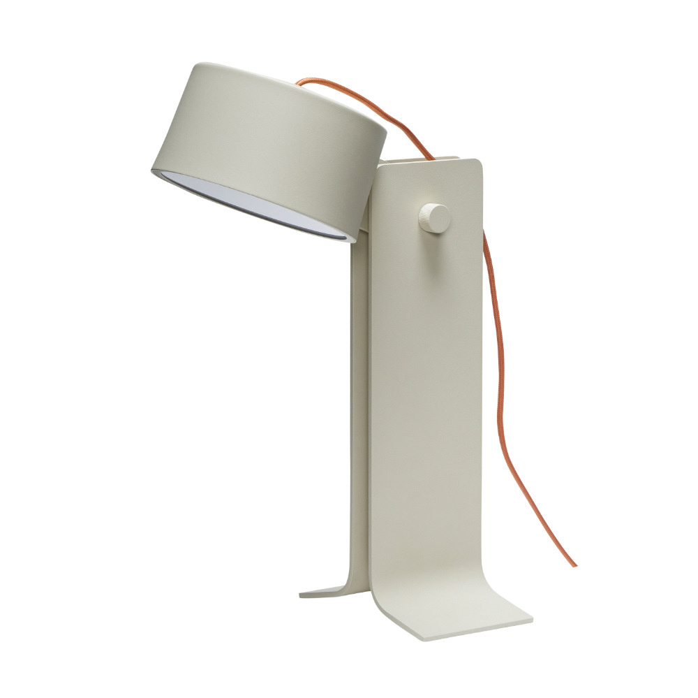 Prachtig gestyleerde metalen design tafellamp. Uitgevoerd in zandkleur met opvallende oranje snoer. Deze tafellamp heeft een geïntegreerde dimbare aan-uit schakelaar voor een luxueuze uitstraling.