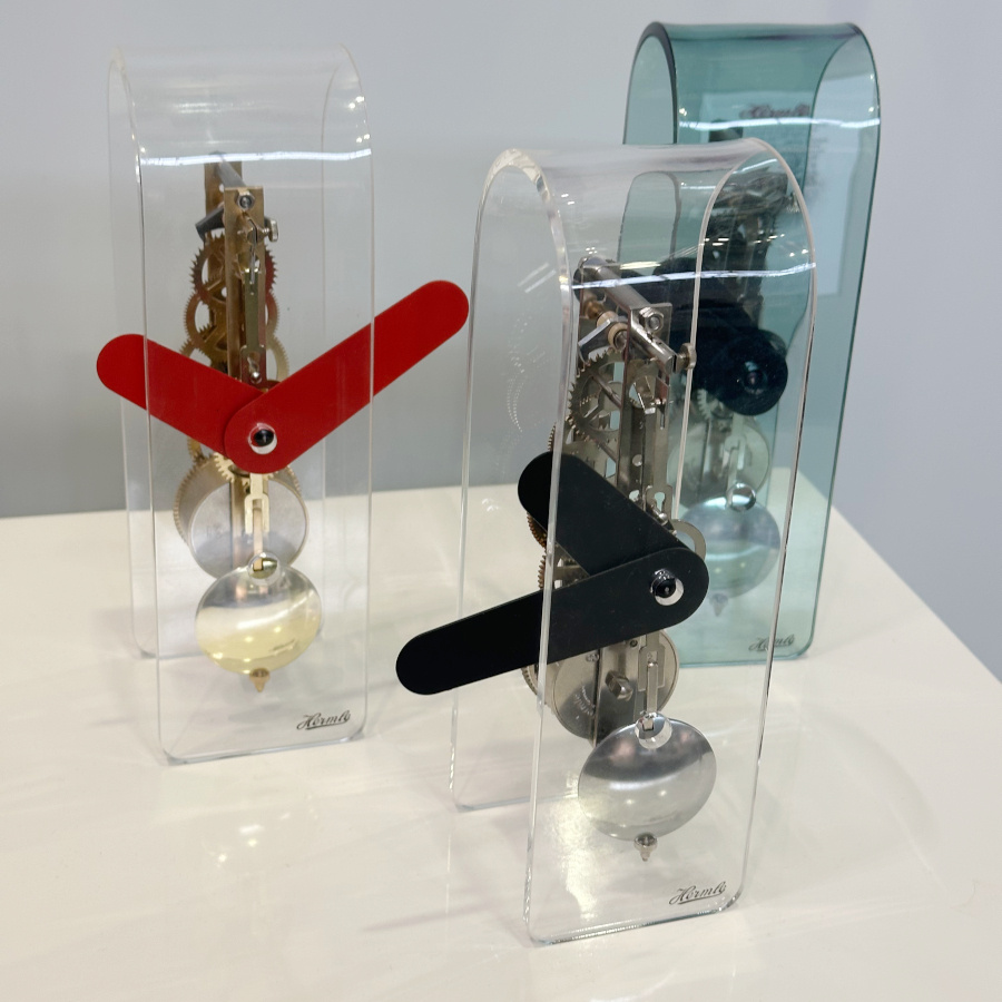 Deze tafelklok van acryl combineert modern design met traditionele horlogetechniek. De transparante kast van helder acryl biedt een mooi inzicht in het fijn mechanische uurwerk met pendel, waarvan de tandwielen en bewegingen zichtbaar zijn. Traditioneel vakmanschap in een modern 'jasje'. Een leuk detail is dat het logo is afgestemde op de kleur van de wijzers. Met zijn strakke lijnen en minimalistische esthetiek past deze klok perfect in moderne interieurs. Het is niet alleen functioneel, maar ook een stijlvol statement piece: een tijdloze blikvanger die techniek en design harmonieus combineert.