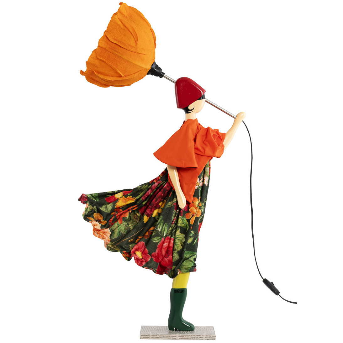 Handgemaakte tafellamp door het Griekse kunstenaarscollectief Skitso uit Thessaloniki. Deze lamp heeft de vorm van een charmante dame met in haar hand een paraplu in bloemvorm. Aan de omgeklapte paraplu en de naar achteren wapperende kleding zie je dat er een flinke bries staat. Maar naast charmant is dit bloemenmeisje ook onverschrokken. Ze trotseert moeiteloos de wind.
