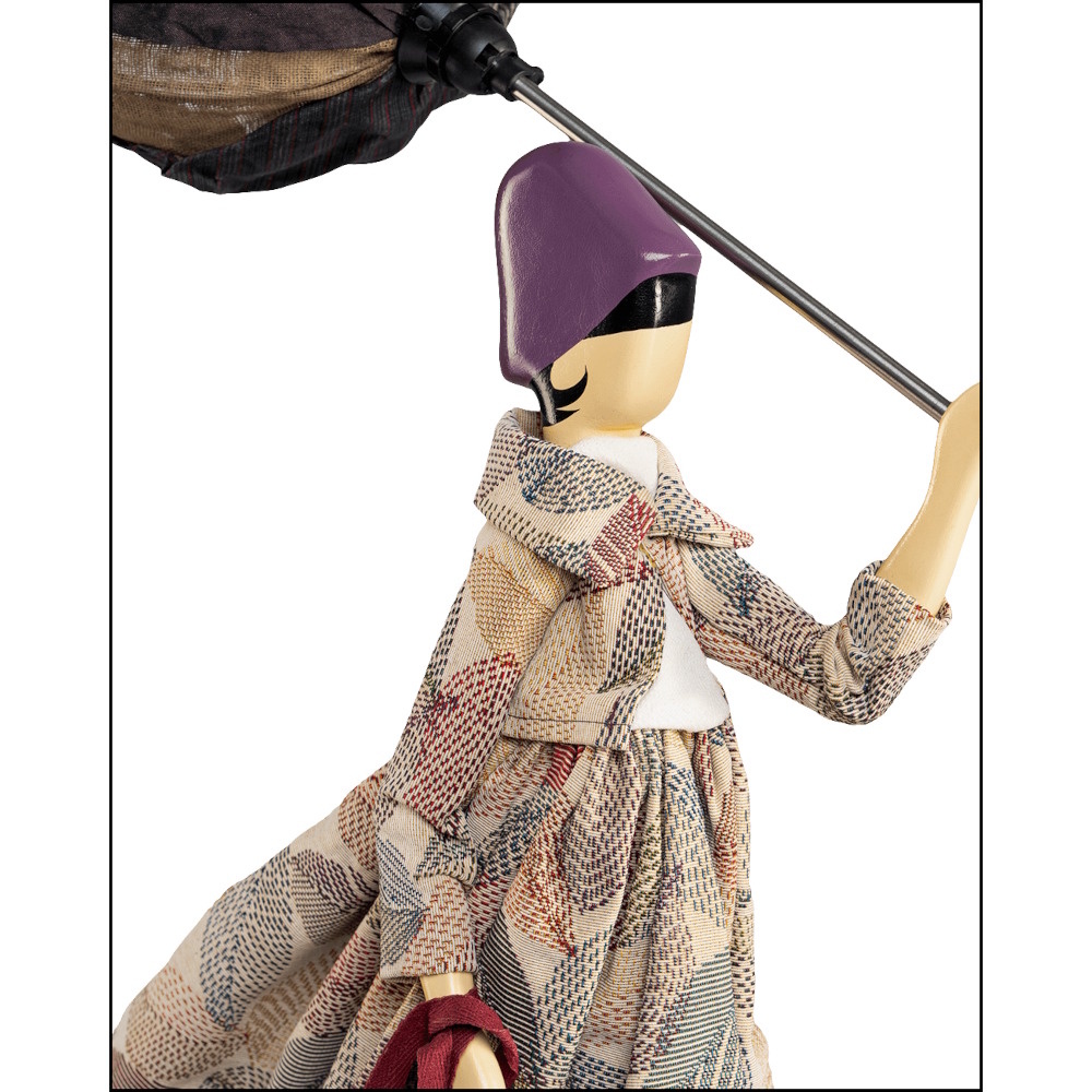 De prachtige bloemparaplu dient als lampenkap en is gemaakt van nikkelkleurig metaal gestoffeerd met verschillende bloemblaadjes. De basis van de vrouw is gemaakt van beschilderd hout. Verder draagt Filyra een tweedelige set gedecoreerd met in de stof geweven bloemblaadjes. Alles in passende aardetinten. Zoals ook haar paarse hoedje en laarzen. Als echt bloemenmeisje heeft Filyra symbolisch in haar rechterhand drie dezelfde bloemblaadjes als verwerkt in haar paraplu.