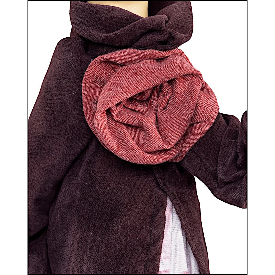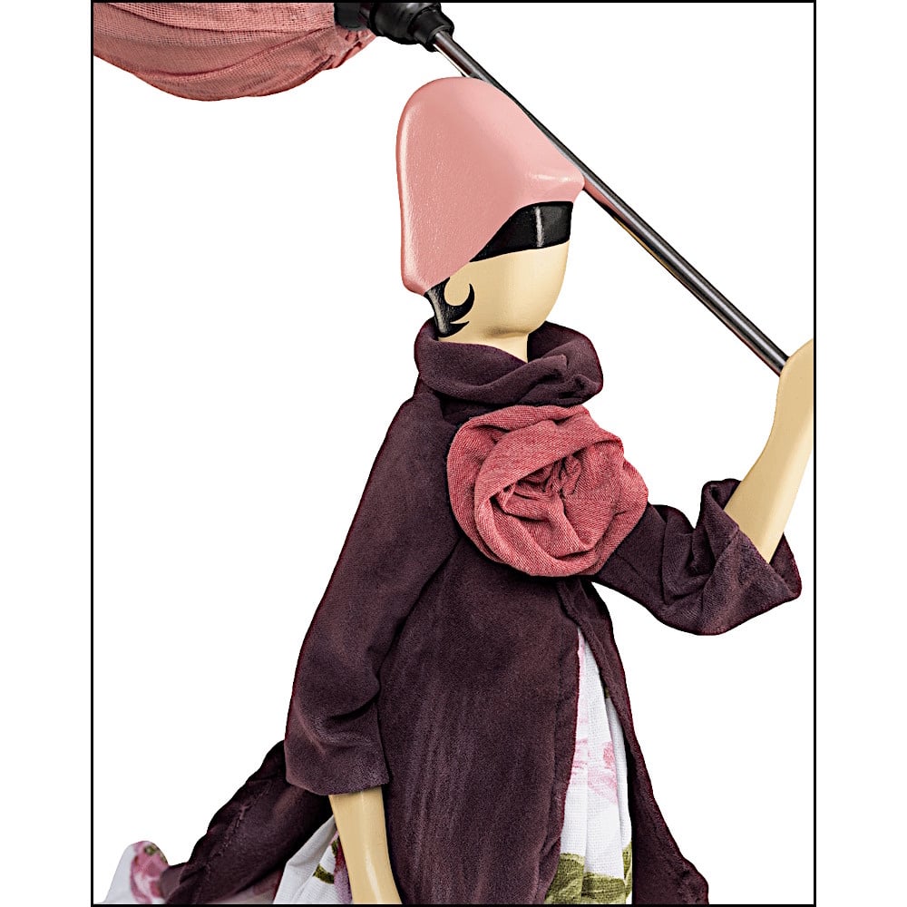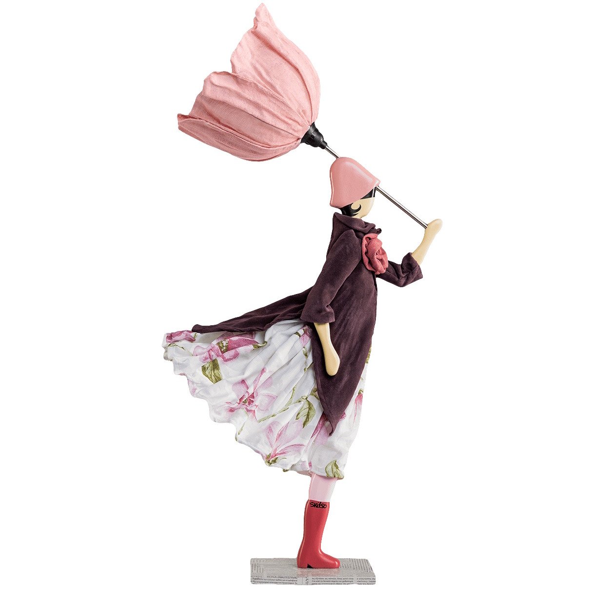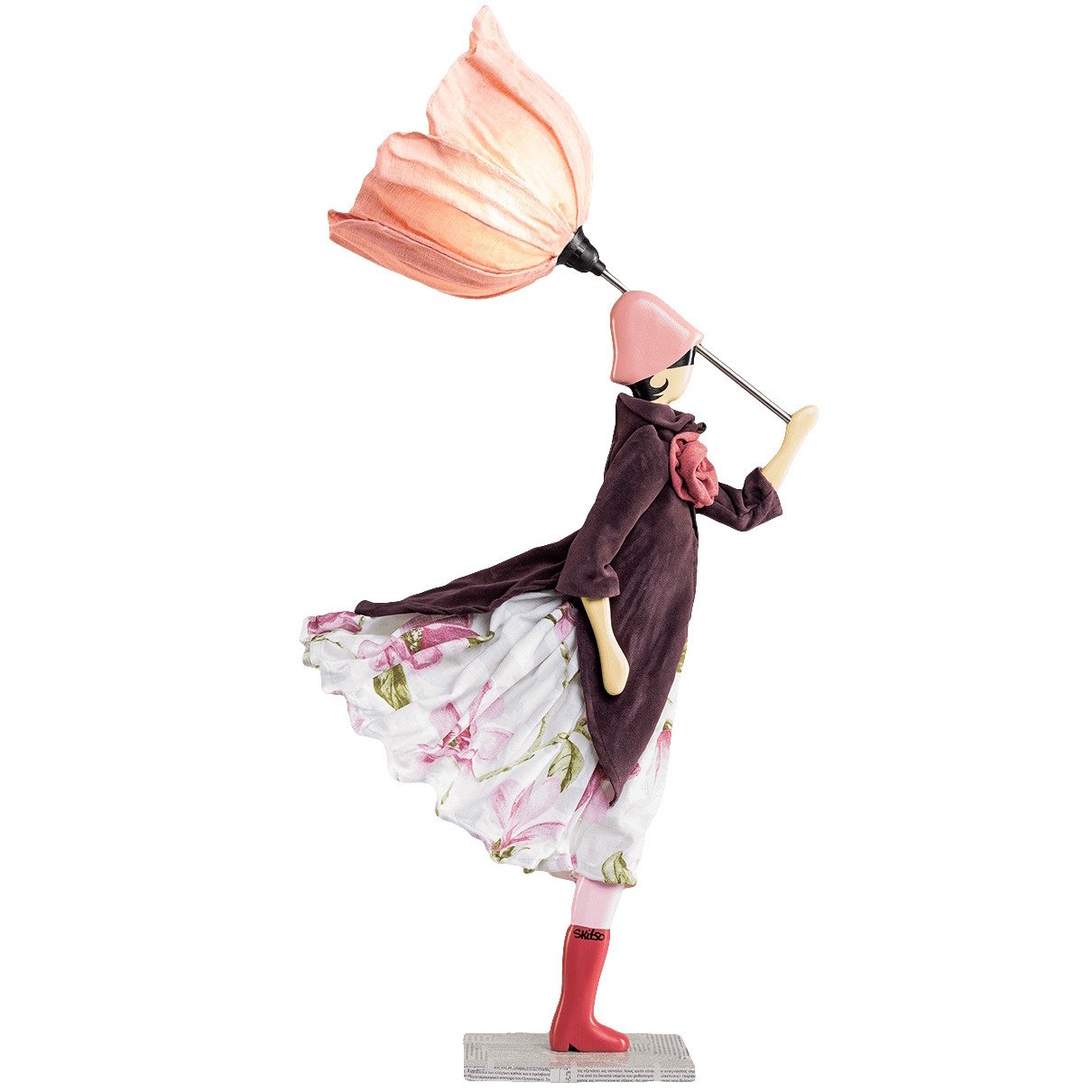 Dit fleurige model heeft een geplooide bloemparaplu die dient als lampenkap en is gemaakt van nikkelkleurig metaal met opgestijfd kaasdoek. De basis van de vrouw is gemaakt van beschilderd hout. Stimona is gekleed in verschillende rode aardetinten. Zo draagt ze een ruime witte jurk gedecoreerd met een prachtige bloemenprint in roze en olijfgroen en heeft ze een bruinrode jas aan die uitloopt in lange punten. Op de jas heeft ze een grote corsage in de vorm van een bloem gekleurd in oudroze. De bloemparaplu of lampenkap is samen met haar hoedje uitgevoerd in lichtroze, haar laarzen dan weer passend in donkerroze.