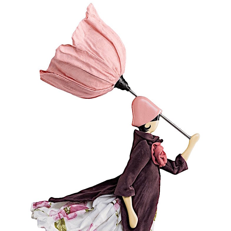 Handgemaakte tafellamp door het Griekse kunstenaarscollectief Skitso uit Thessaloniki. Deze lamp heeft de vorm van een charmante dame met in haar hand een paraplu in bloemvorm. Aan de omgeklapte paraplu en de naar achteren wapperende kleding zie je dat het flink waait. Maar naast charmant is dit ook een sterk bloemenmeisje. Zodoende loopt ze zonder problemen tegen de wind in.