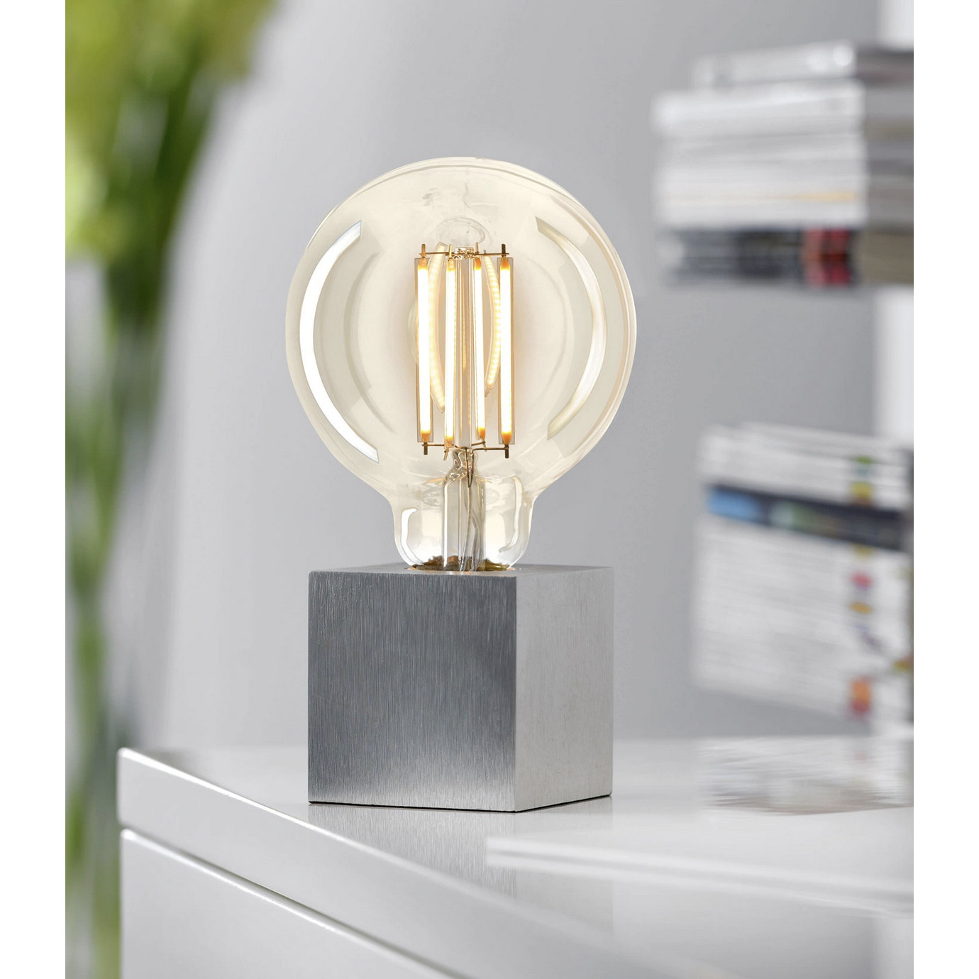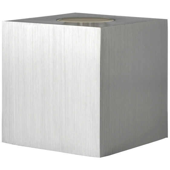 Deze zilveren cubus van 8 x 8 x 8 cm heeft een E27 fitting, voorzien van een doorzichtig elektriciteitssnoer met stekker en aan/uit schakelaar. Exclusief lichtbron.