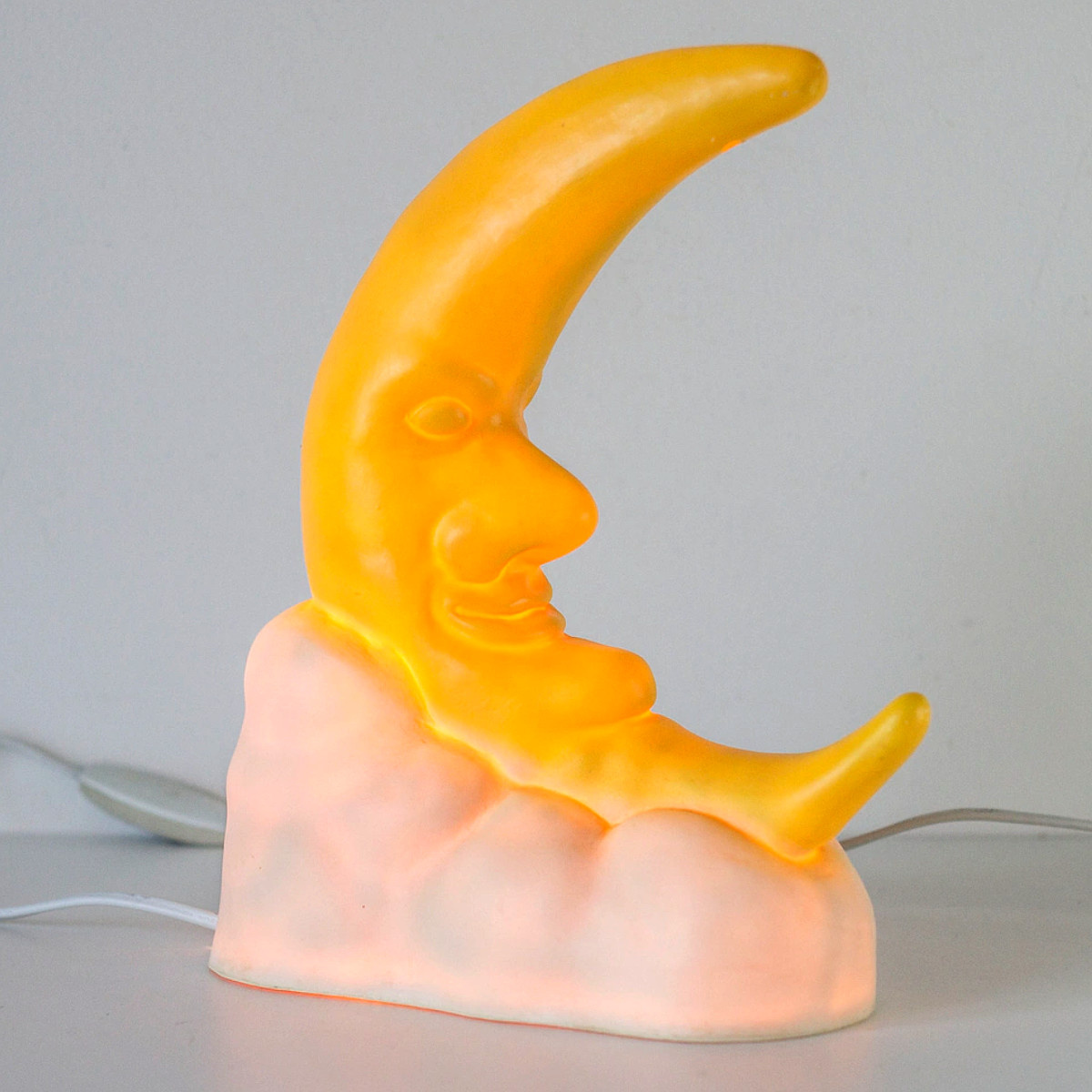 Retro tafellamp in de vorm van een halve maan. Vormgegeven in geel met een vriendelijk gezicht en gesitueerd op een witte wolk. Een decoratieve en karaktervolle lamp.