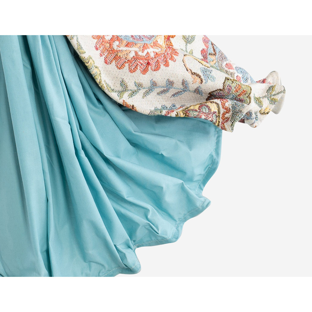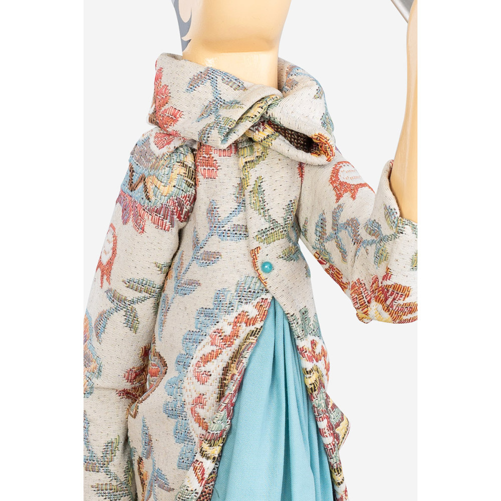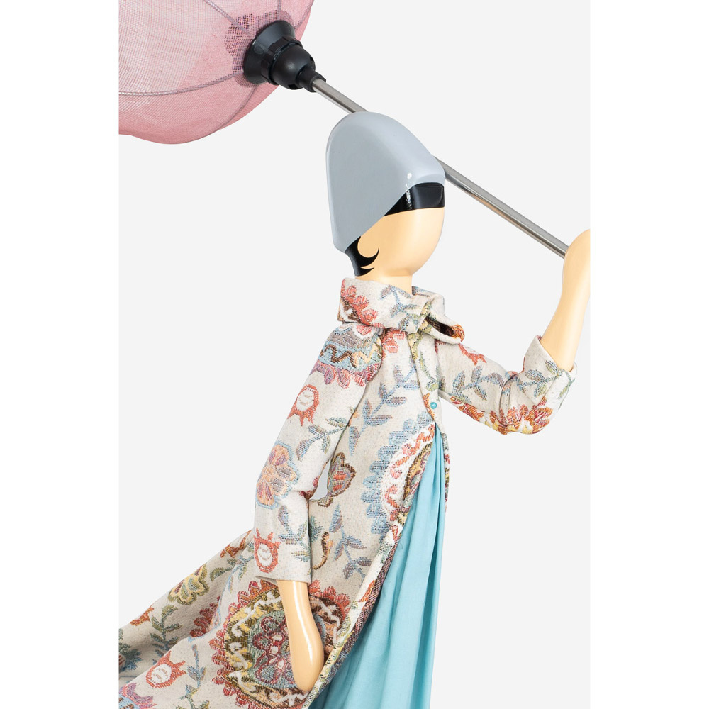 De paraplu dient als lampenkap en is gemaakt van nikkelkleurig metaal met opgestijfd kaasdoek. De basis van de vrouw is gemaakt van beschilderd hout. Alice is gekleed in een frisse outfit. Ze draagt een prachtige lange jas met moderne print over een lichtblauwe jurk. Ook de laarzen zijn in bijpassend lichtblauw, het hoedje in lichtgrijs en de paraplukap in oudroze. Een bijzonder fraai geheel. Voor de opgewaaide uitstraling zit er onderin de jas ijzerdraad verwerkt. De vierkante voet is van hout en beplakt met delen van Europese kranten. De lamp is voorzien van zwart elektriciteitssnoer met aan/uit schakelaar.