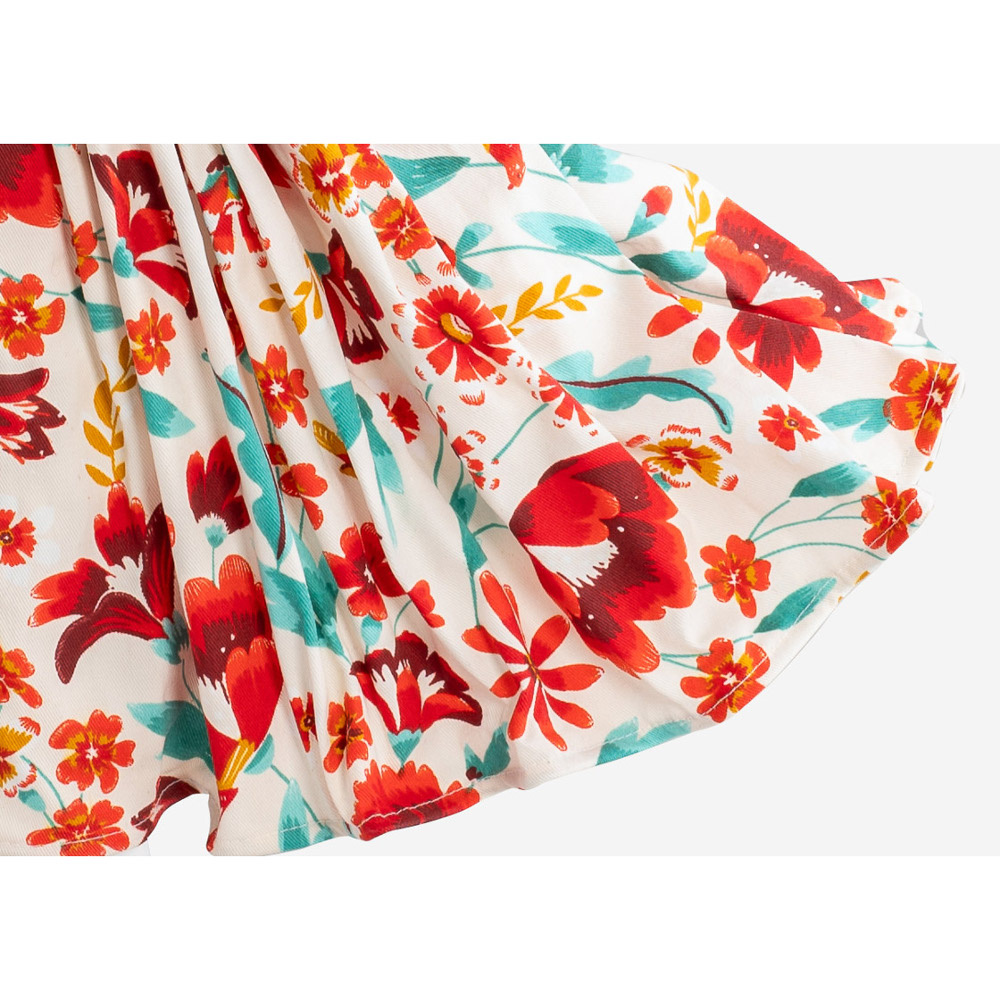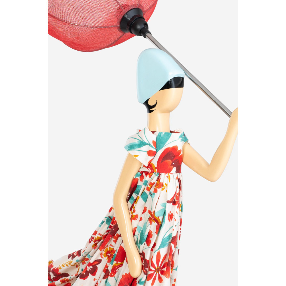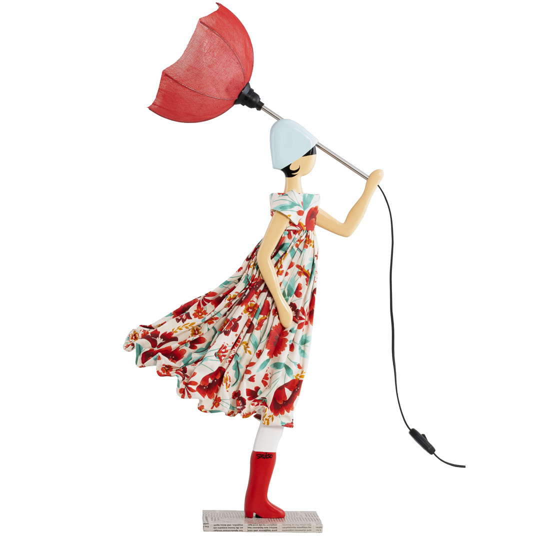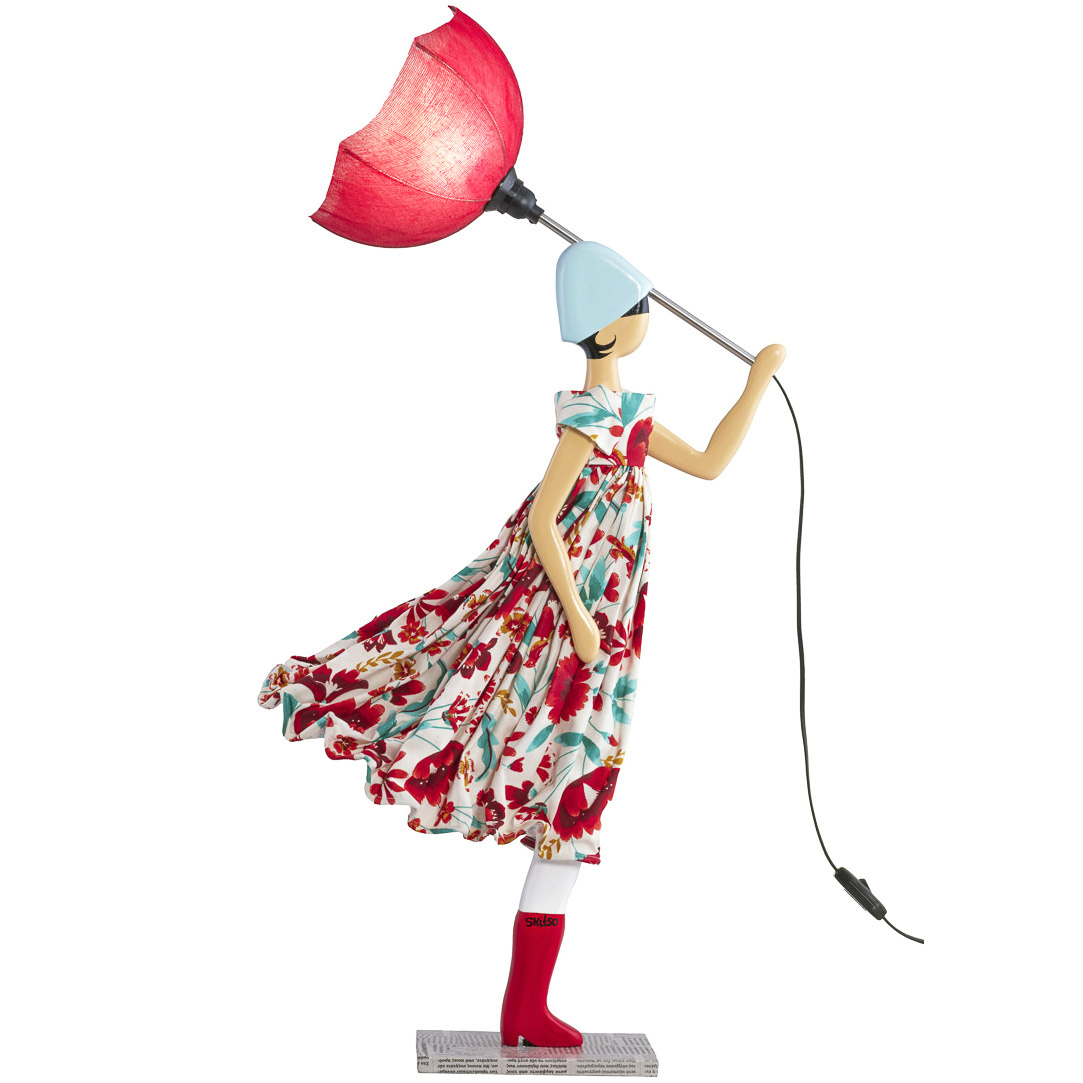 De paraplu dient als lampenkap en is gemaakt van nikkelkleurig metaal met opgestijfd kaasdoek. De basis van de vrouw is gemaakt van met de hand beschilderd hout. Verder is Andrea aangekleed in een prachtige combinatie van roodtinten. Daarbij staat de geplooide jurk met bloemenmotief in het middelpunt. De rode laarsjes en lampenkap vormen de bijpassende accenten. Voor de opgewaaide uitstraling zit er onderin de jurk ijzerdraad verwerkt. De vierkante voet is van hout en beplakt met delen van Europese kranten. De lamp is voorzien van zwart elektriciteitssnoer met aan/uit schakelaar.