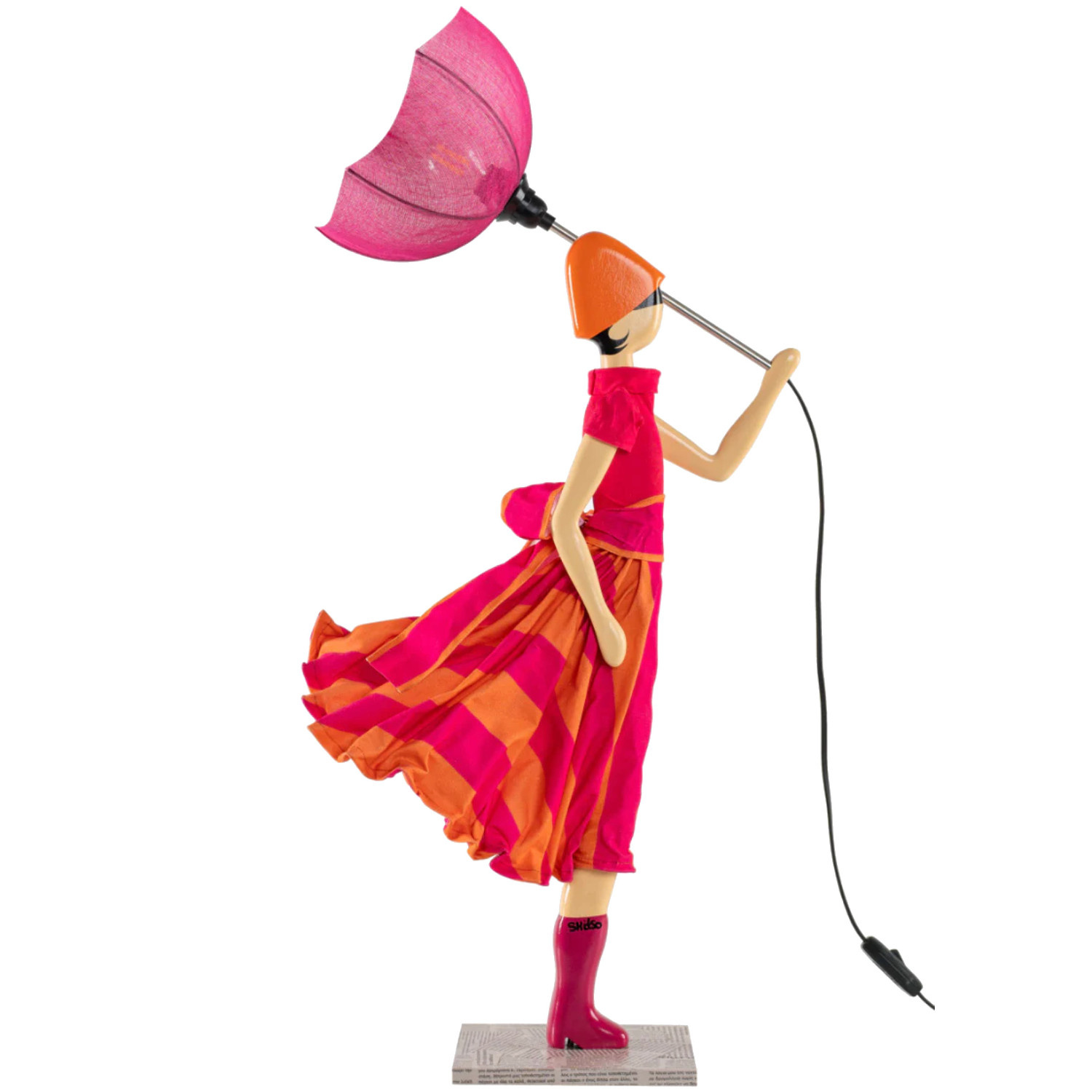 De paraplu dient als lampenkap en is gemaakt van nikkelkleurig metaal met opgestijfd kaasdoek. De basis van de vrouw is gemaakt van beschilderd hout. Verder is Apostolia gekleed in een moderne outfit in de kleuren magenta/oranje. Alles in stijl op elkaar afgestemd. Zo is haar rok voorzien van een breed strepen patroon en een grote strik in de rug. Dit alles in dezelfde kleurencombinatie! Ook haar laarsjes en hoedje zijn passend in dezelfde basiskleuren uitgevoerd. Voor de opgewaaide uitstraling zit er onderin de jurk ijzerdraad verwerkt. De vierkante voet is van hout en beplakt met delen van Europese kranten. De lamp is voorzien van zwart elektriciteitssnoer met aan/uit schakelaar.