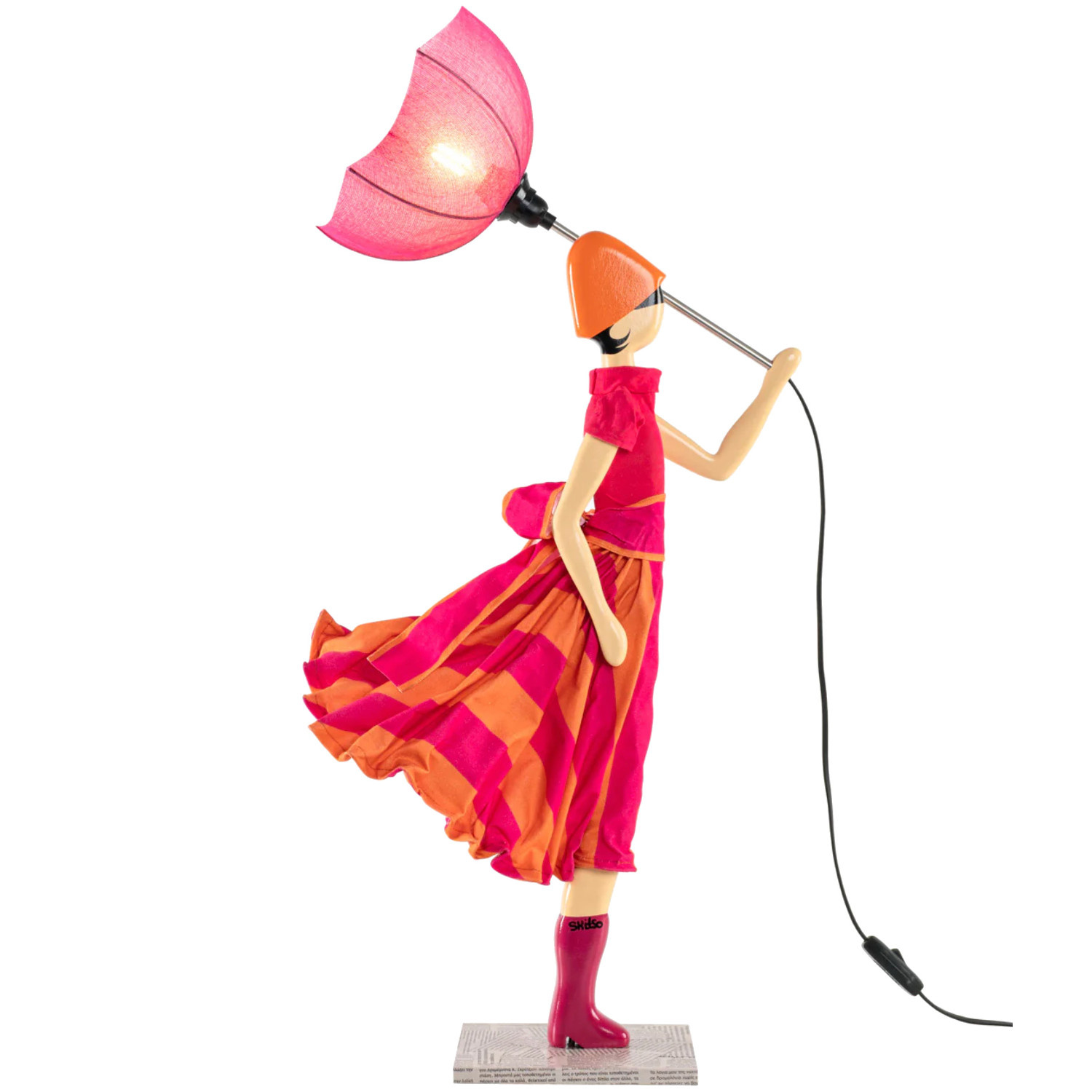 Handgemaakte tafellamp door het Griekse kunstenaarscollectief Skitso uit Thessaloniki. Deze lamp heeft de vorm van een charmante dame met in haar hand een paraplu. Aan de omgeklapte paraplu en de naar achteren wapperende kleding zie je dat er een flinke bries staat. Maar naast charmant is deze dame ook onverschrokken. Ze trotseert moeiteloos de wind.