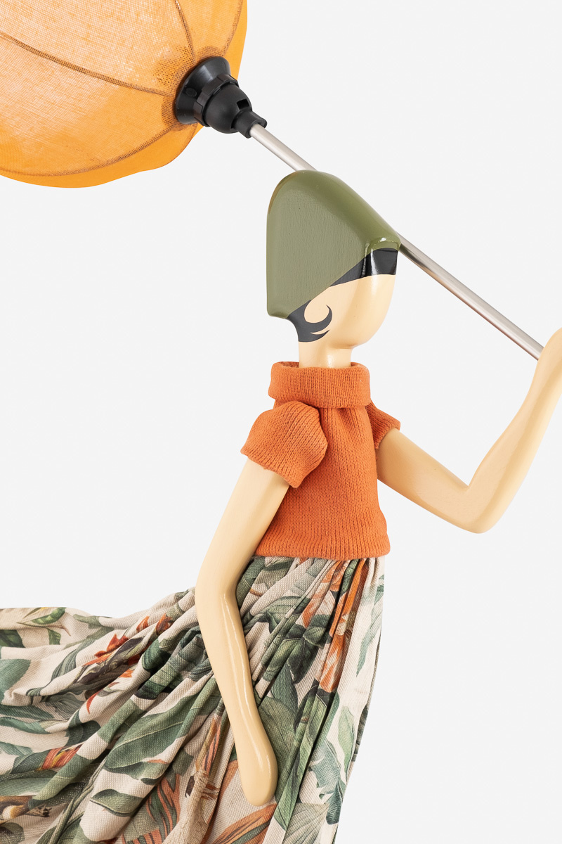 Handgemaakte tafellamp door het Griekse kunstenaarscollectief Skitso uit Thessaloniki. Deze lamp heeft de vorm van een charmante dame met in haar hand een paraplu. Aan de omgeklapte paraplu en de naar achteren wapperende kleding zie je dat er een flinke bries staat. Maar naast charmant is deze dame ook onverschrokken. Ze trotseert moeiteloos de wind.