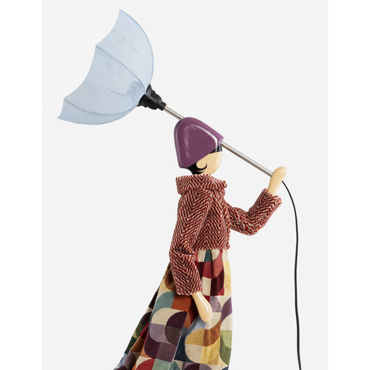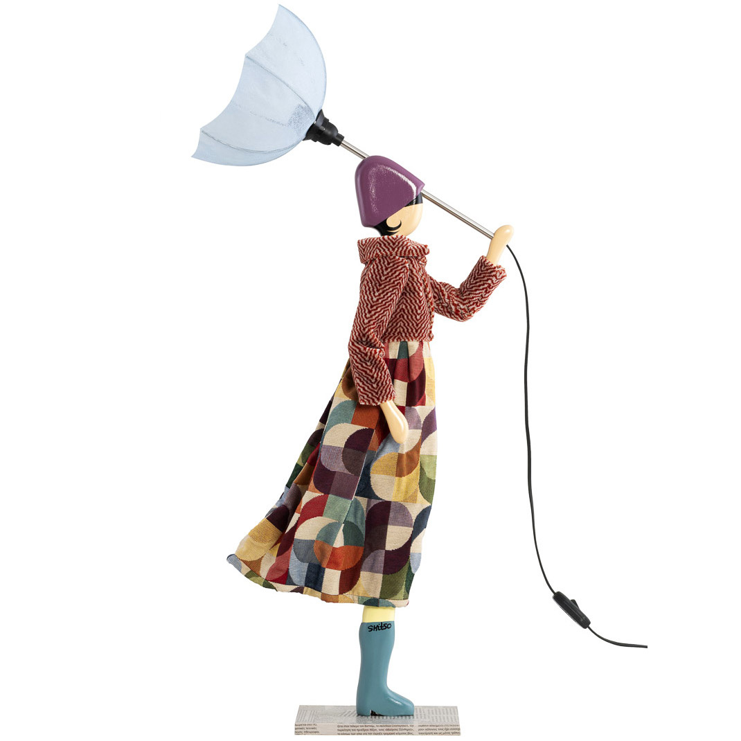 Handgemaakte tafellamp door het Griekse kunstenaarscollectief Skitso uit Thessaloniki. Deze lamp heeft de vorm van een charmante dame met in haar hand een paraplu. Aan de omgeklapte paraplu en de naar achteren wapperende kleding zie je dat er een flinke bries staat. Maar naast charmant is het ook een stoutmoedige dame. Ze trotseert moeiteloos de wind.