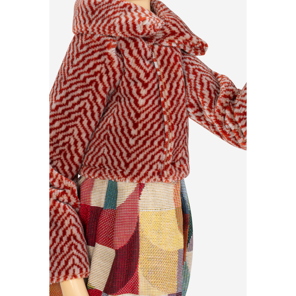 De paraplu dient als lampenkap en is gemaakt van nikkelkleurig metaal met opgestijfd kaasdoek. De basis van de vrouw is gemaakt van beschilderd hout. Verder is Billy gekleed in een kort warm vest met rood/witte belijningen op een driekwart rok met kleurrijke geometrische vormen. Haar laarsjes zijn in turquoise, de paraplukap in blauw en haar hoedje in paars. Kortom, allemaal passende aardetinten. Voor de opgewaaide uitstraling zit er onderin de jurk ijzerdraad verwerkt. De vierkante voet is van hout en beplakt met delen van Europese kranten. De lamp is voorzien van zwart elektriciteitssnoer met aan/uit schakelaar.