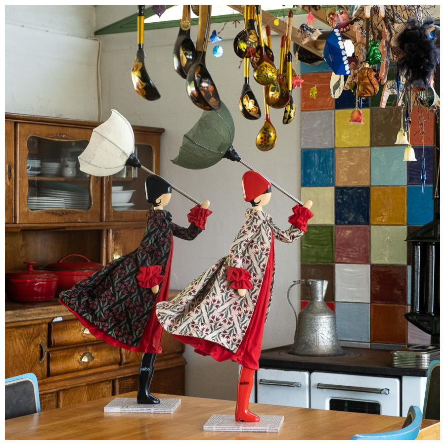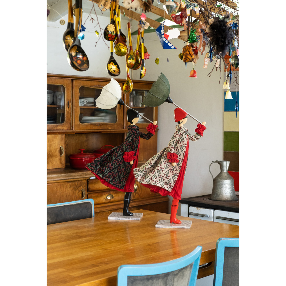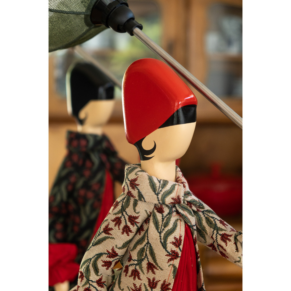 Handgemaakte tafellamp door het Griekse kunstenaarscollectief Skitso uit Thessaloniki. Deze lamp heeft de vorm van een charmante dame met in haar hand een paraplu. Aan de omgeklapte paraplu en de naar achteren wapperende kleding zie je dat er een flinke bries staat. Maar naast charmant is deze dame ook onverschrokken. Ze trotseert moeiteloos de wind.