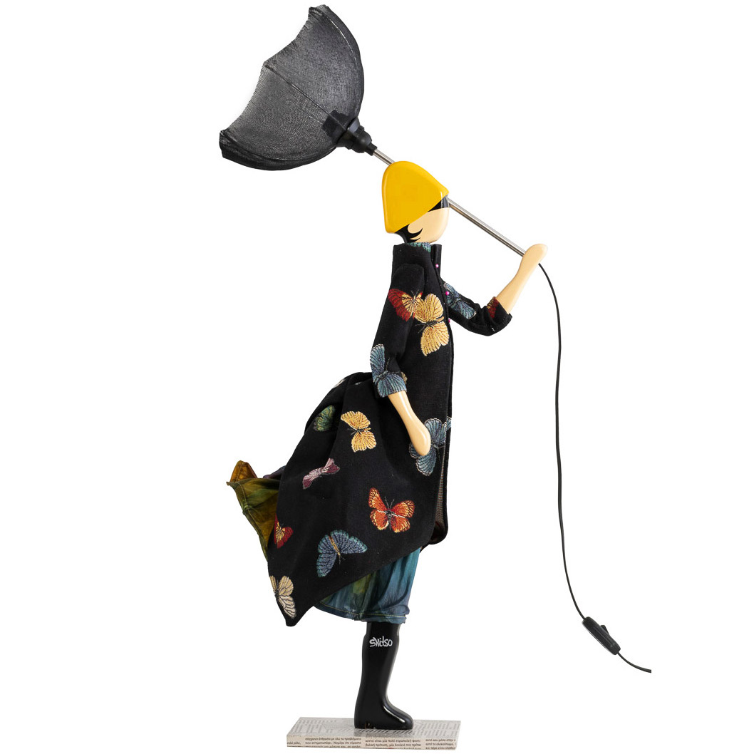 Handgemaakte tafellamp door het Griekse kunstenaarscollectief Skitso uit Thessaloniki. Deze lamp heeft de vorm van een charmante dame met in haar hand een paraplu. Aan de omgeklapte paraplu en de naar achteren wapperende kleding zie je dat er een flinke bries staat. Maar naast charmant is deze dame ook onverschrokken. Ze trotseert moeiteloos de wind.