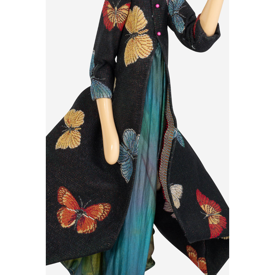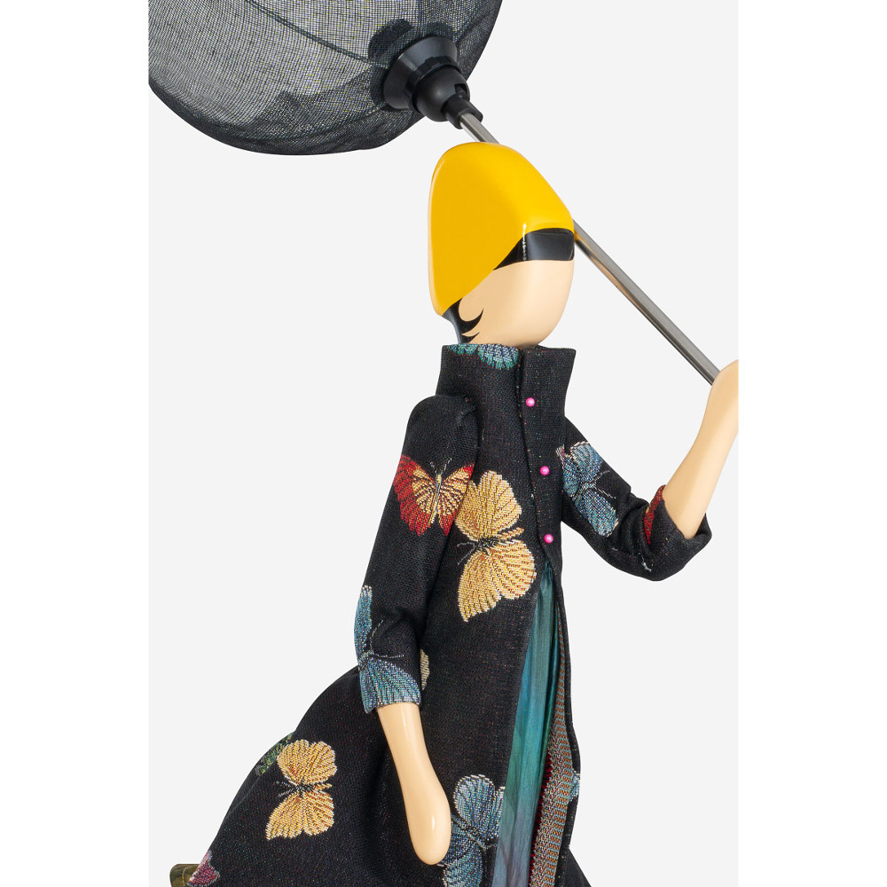 De paraplu dient als lampenkap en is gemaakt van nikkelkleurig metaal met opgestijfd kaasdoek. De basis van de vrouw is gemaakt van beschilderd hout. Verder is Flaia gekleed in een fantastisch mooie lange jas in stevige zwart stof, gedecoreerd met gekleurde vlinders. Daaronder draagt ze een jurk in petrol en voor het contrast heeft ze een geel hoedje op. Voor de opgewaaide uitstraling zit er onderin de jas ijzerdraad verwerkt. De vierkante voet is van hout en beplakt met delen van Europese kranten. De lamp is voorzien van zwart elektriciteitssnoer met aan/uit schakelaar.
