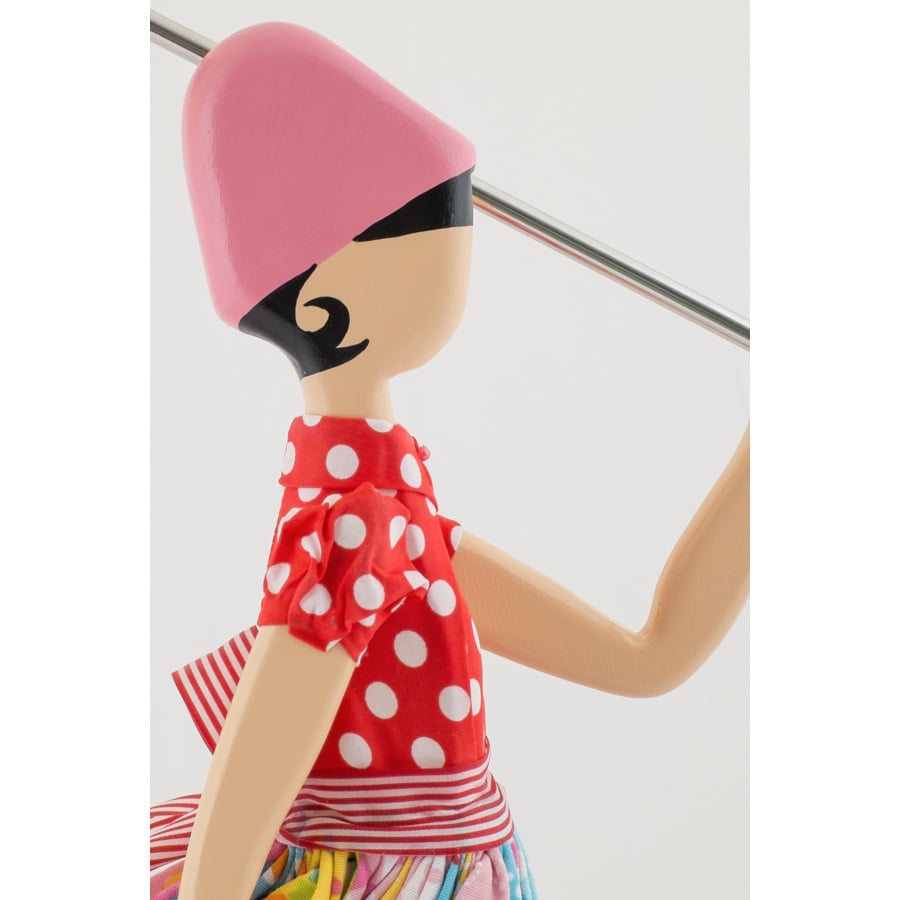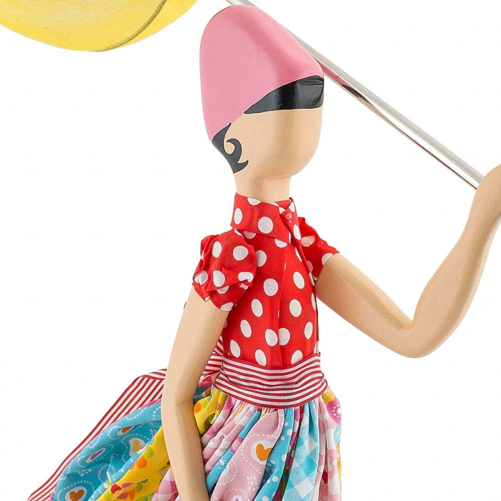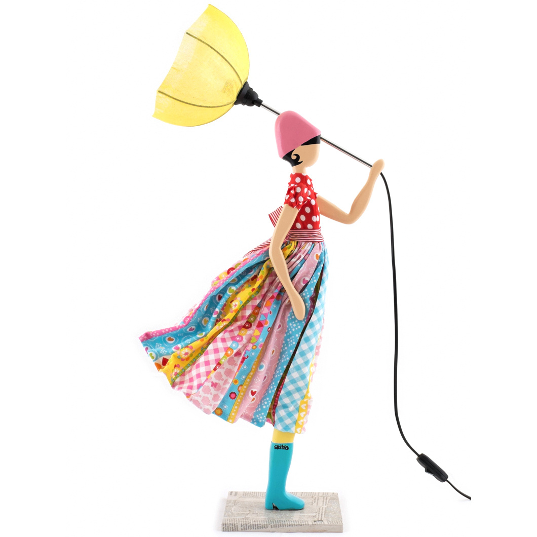 Handgemaakte tafellamp door het Griekse kunstenaarscollectief Skitso uit Thessaloniki. Deze lamp heeft de vorm van een charmante dame met in haar hand een paraplu. Aan de omgeklapte paraplu en de naar achteren wapperende kleding zie je dat er een flinke bries staat. Maar naast charmant is deze dame ook onverschrokken. Ze trotseert moeiteloos de wind.