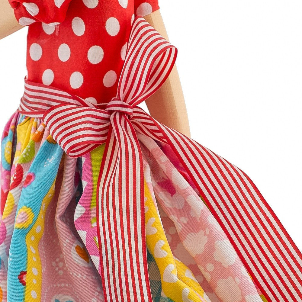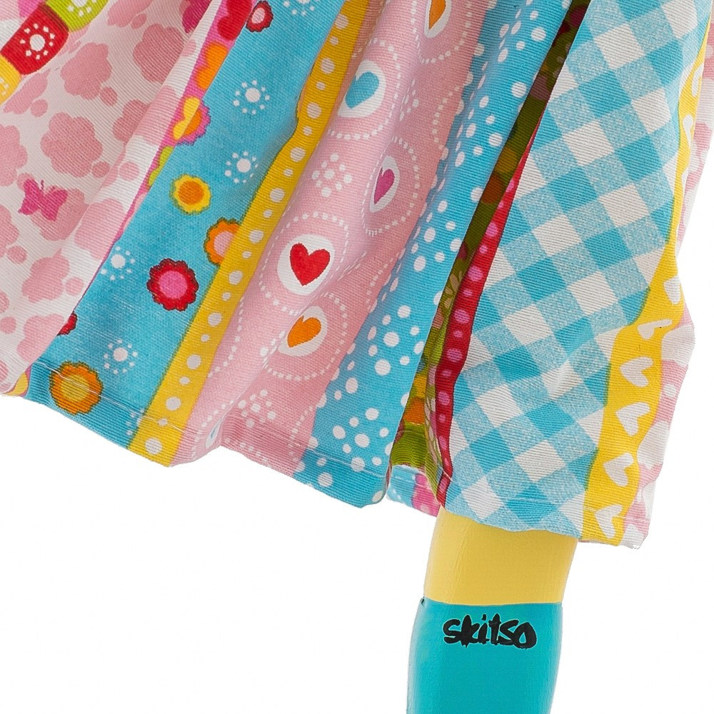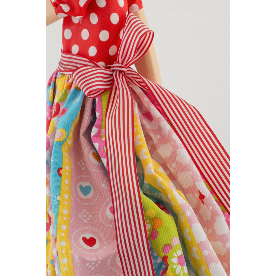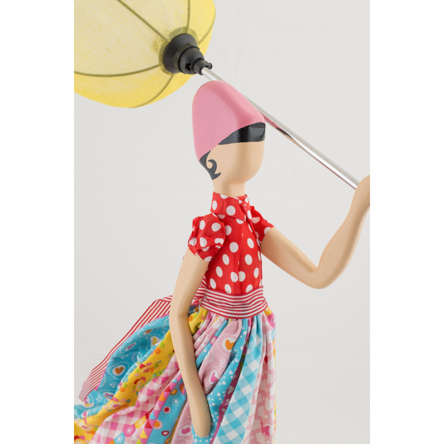 De paraplu dient als lampenkap en is gemaakt van nikkelkleurig metaal met opgestijfd kaasdoek. De basis van de vrouw is gemaakt van beschilderd hout. Verder is Iris gekleed in een frisse kleurrijke voorjaarsoutfit. Zo bestaat haar jurk uit een collage van verschillende stofdelen uitgevoerd in de kleuren lichtblauw, geel, roze en rood. Daarop draagt ze een rode blouse met witte polkadot en korte mouwtjes. Ook haar laarsjes, hoedje en lampenkap zijn weer passend in dezelfde kleuren uitgevoerd als haar jurk. Ter afsluiting heeft Iris rond haar middel een grote rood/wit gestreepte strik. Voor de opgewaaide uitstraling zit er onderin de jurk ijzerdraad verwerkt. De vierkante voet is van hout en beplakt met delen van Europese kranten. De lamp is voorzien van zwart elektriciteitssnoer met aan/uit schakelaar.