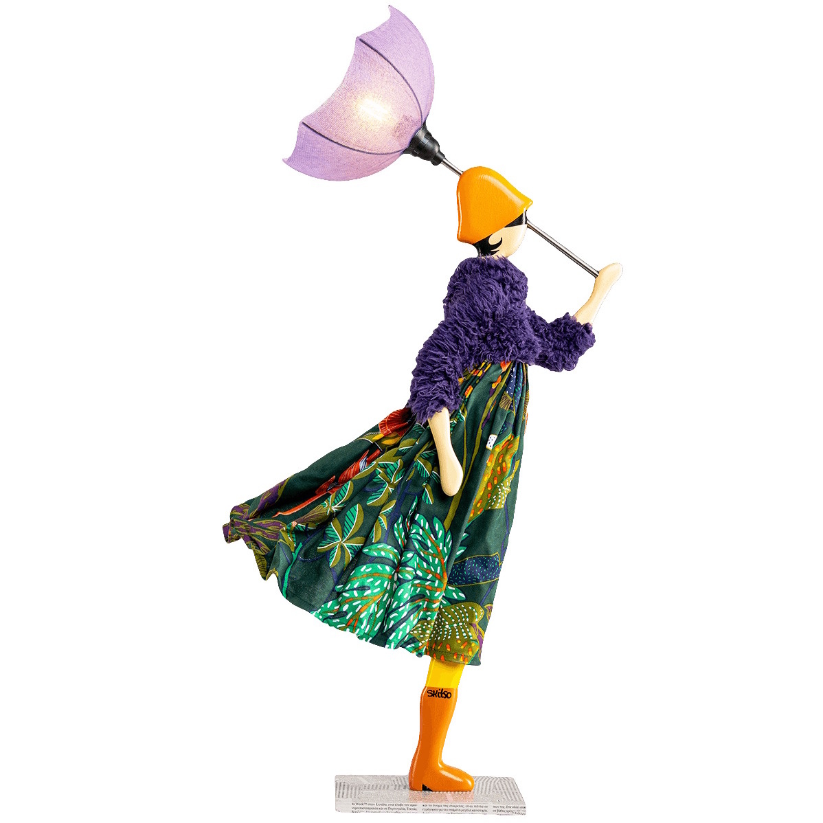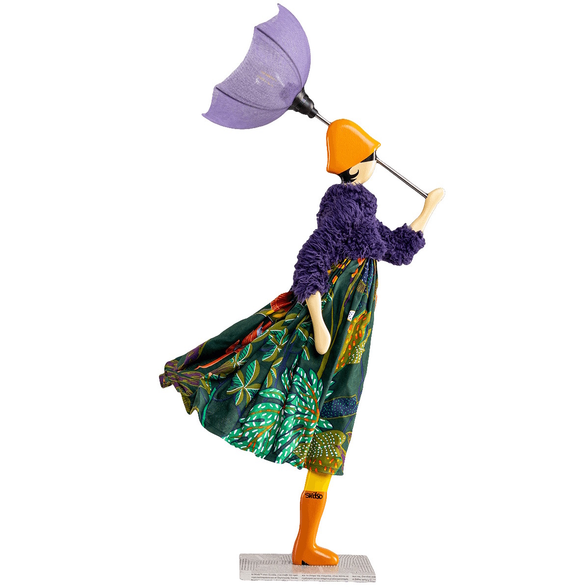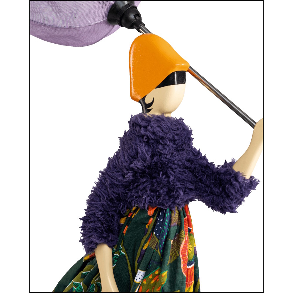 Handgemaakte tafellamp door het Griekse kunstenaarscollectief Skitso uit Thessaloniki. Deze lamp heeft de vorm van een charmante dame met in haar hand een paraplu. Aan de omgeklapte paraplu en de naar achteren wapperende kleding zie je dat er een behoorlijke wind waait. Maar naast charmant staat deze dame ook stevig in haar schoenen. Zo weerstaat ze met gemak de harde wind.