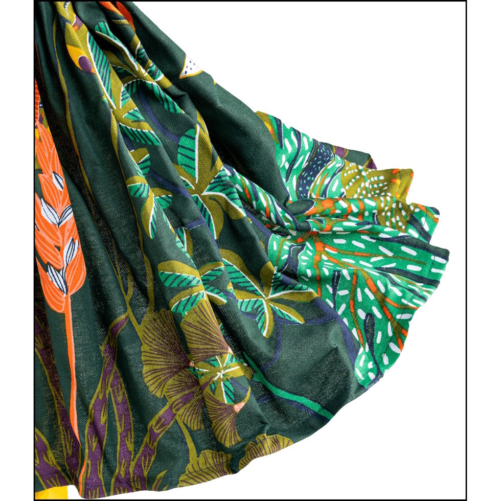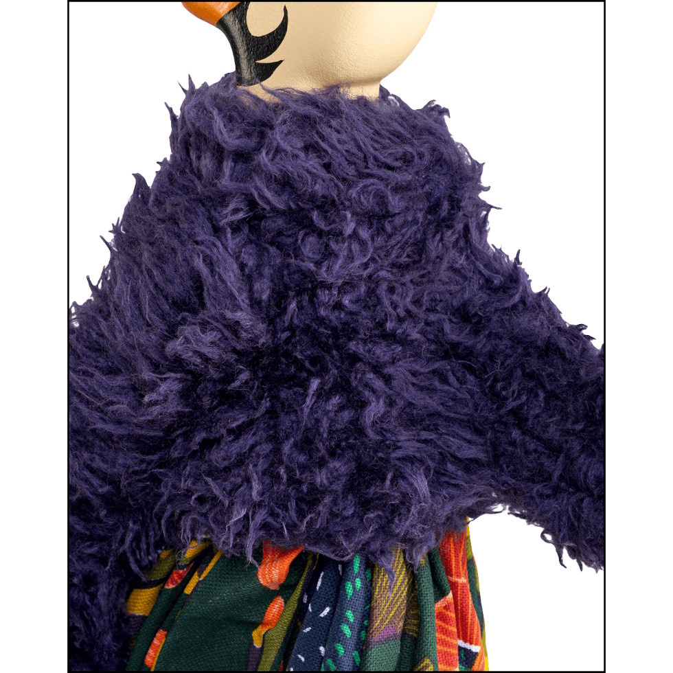 De basis van Karouf is gemaakt van beschilderd hout. De paraplu dient als lampenkap en is gemaakt van nikkelkleurig metaal met opgestijfd kaasdoek. Verder is Karouf gekleed in een opvallende outfit uit tropische kleuren. Zo draagt ze een paars truitje van langharige pluche op een wijde rok met een fleurige print op een donkere ondergrond. Haar laarzen en hoedje zijn in fraai contrasterend oranje, de paraplu weer in bijpassend paars. Voor de opgewaaide uitstraling zit er onderin de rok ijzerdraad verwerkt. De lamp is voorzien van zwart elektriciteitssnoer met aan/uit schakelaar.