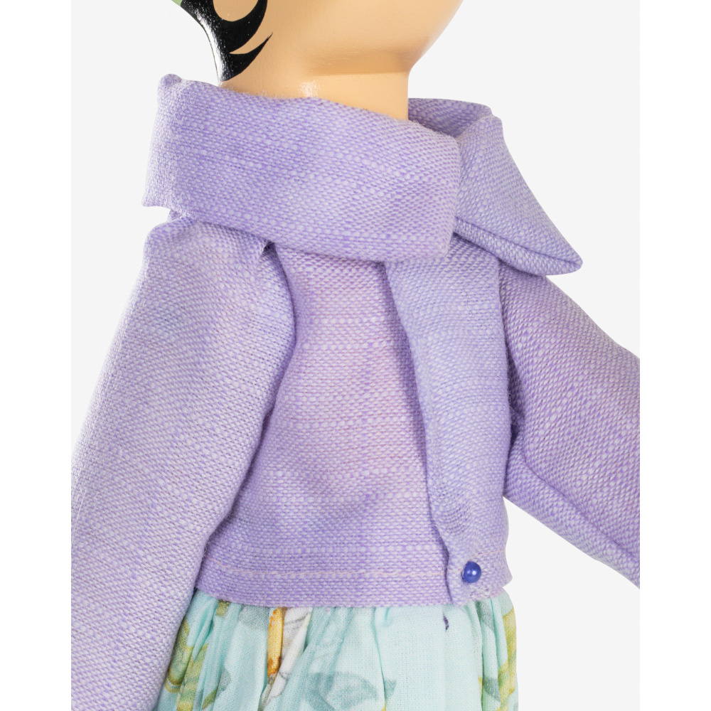 De paraplu dient als lampenkap en is gemaakt van nikkelkleurig metaal met opgestijfd kaasdoek. De basis van de vrouw is gemaakt van beschilderd hout. Verder is Lavena gekleed in een frisse pastelkleurige voorjaarsoutfit. Zo bestaat haar rok uit een bloemenprint in de kleuren paars, groen en oranje op een lichtblauwe ondergrond. Daarop draagt ze een lila blouse met een grote decoratieve kraag en half lange mouwen. Ook haar laarsjes, hoedje en lampenkap zijn passend uitgevoerd in dezelfde kleuren. Voor de opgewaaide uitstraling zit er onderin de jurk ijzerdraad verwerkt. De vierkante voet is van hout en beplakt met delen van Europese kranten. De lamp is voorzien van zwart elektriciteitssnoer met aan/uit schakelaar.