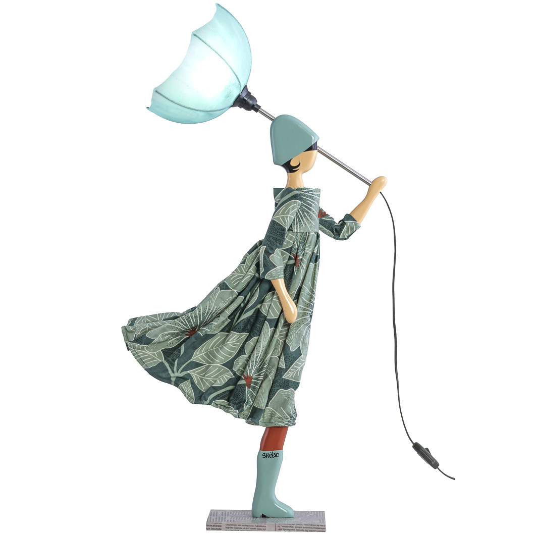 Handgemaakte tafellamp door het Griekse kunstenaarscollectief Skitso uit Thessaloniki. Deze lamp heeft de vorm van een charmante dame met in haar hand een paraplu. Aan de omgeklapte paraplu en de naar achteren wapperende kleding zie je dat er een flinke bries staat. Maar naast charmant is deze dame ook onverschrokken. Ze trotseert moeiteloos de wind.