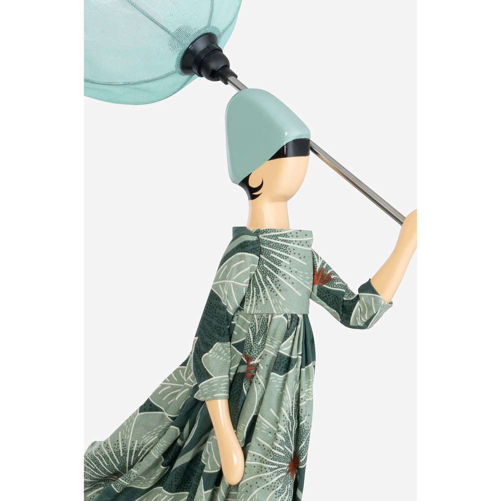 De paraplu dient als lampenkap en is gemaakt van nikkelkleurig metaal met opgestijfd kaasdoek. De basis van de vrouw is gemaakt van beschilderd hout. Verder is Lois gekleed in een perfect afgestemd ensemble. Bestaande uit een geplooide donkergroene jurk voorzien van bladmotief in lichtgroen met bijpassende laarsjes en hoedje tevens in lichtgroen. Voor de opgewaaide uitstraling zit er onderin de jurk ijzerdraad verwerkt. De vierkante voet is van hout en beplakt met delen van Europese kranten. De lamp is voorzien van zwart elektriciteitssnoer met aan/uit schakelaar.
