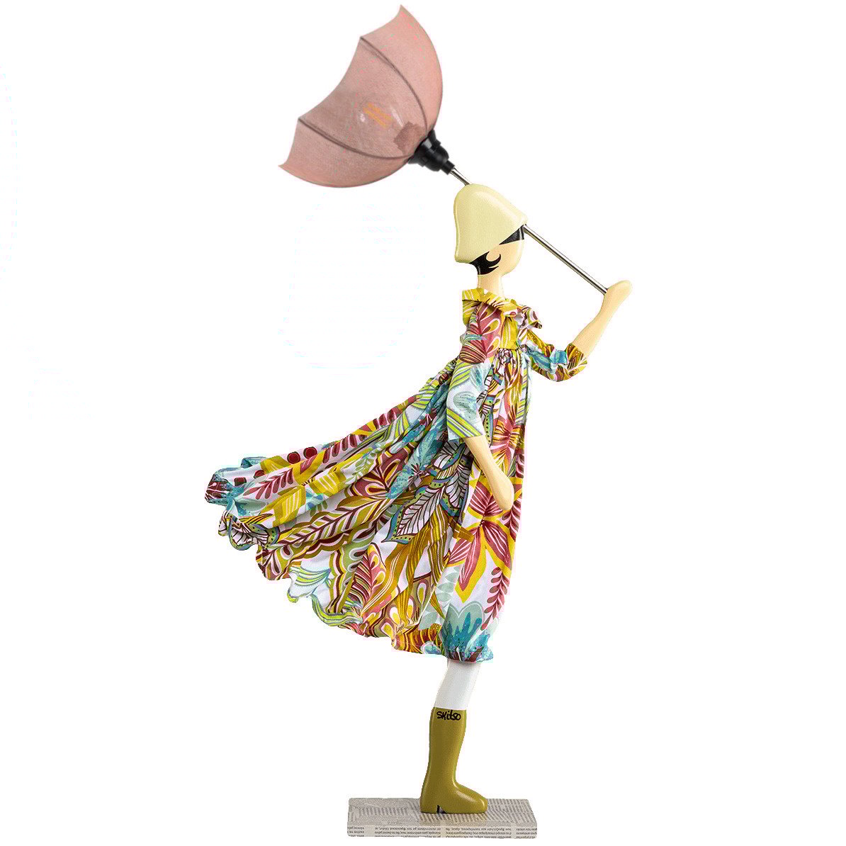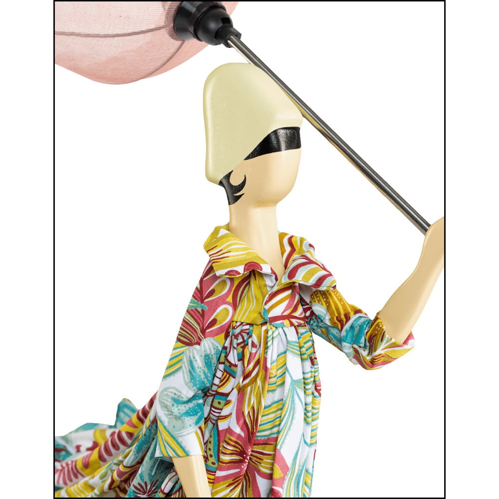 De paraplu dient als lampenkap en is gemaakt van nikkelkleurig metaal met opgestijfd kaasdoek. De basis van de vrouw is gemaakt van beschilderd hout. Lovela heeft een outfit in frisse pasteltinten. Zo draagt ze een ruime jurk met grote kraag en driekwart mouw, gedecoreerd met een veelkleurige fantasieprint. Haar laarzen zijn in olijfgroen, haar hoedje in zachtgeel en haar paraplu in steenrood. Kortom een goed op elkaar afgestemde, frisse combinatie.
