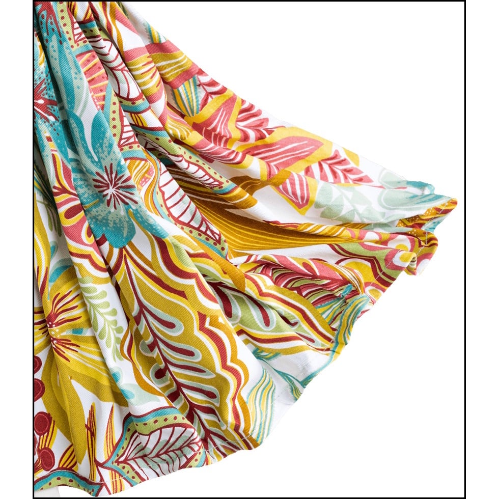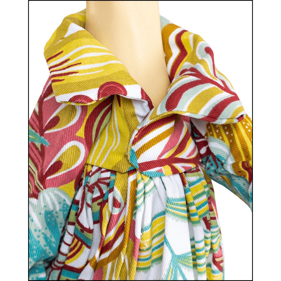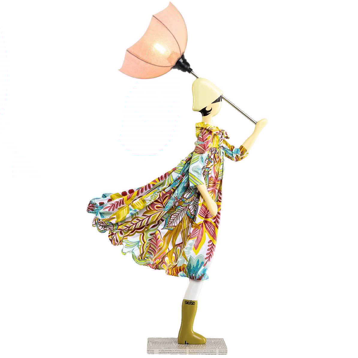 Voor de opgewaaide uitstraling zit er onderin de jurk ijzerdraad verwerkt. De vierkante voet is van hout en beplakt met delen van Europese kranten. De lamp is voorzien van zwart elektriciteitssnoer met aan/uit schakelaar.