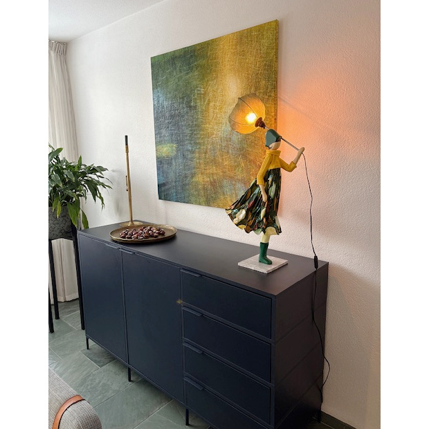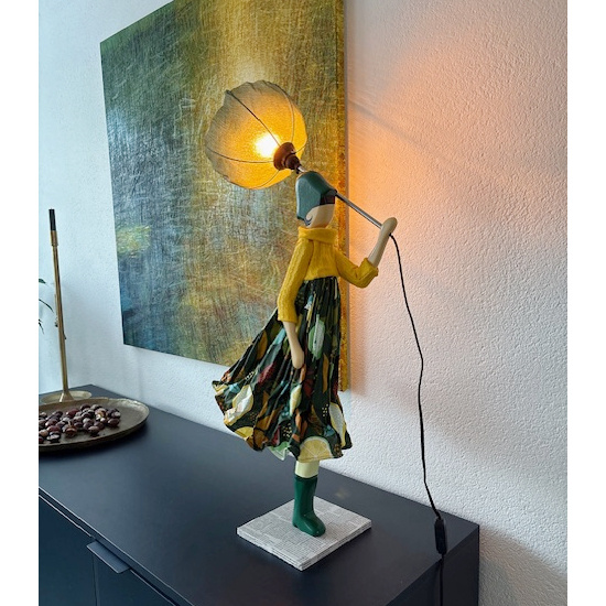 Handgemaakte tafellamp door het Griekse kunstenaarscollectief Skitso uit Thessaloniki. Deze lamp heeft de vorm van een charmante dame met in haar hand een paraplu. Aan de omgeklapte paraplu en de naar achteren wapperende kleding zie je dat er een flinke bries staat. Maar naast charmant is deze dame ook onverschrokken. Ze trotseert moeiteloos de wind.