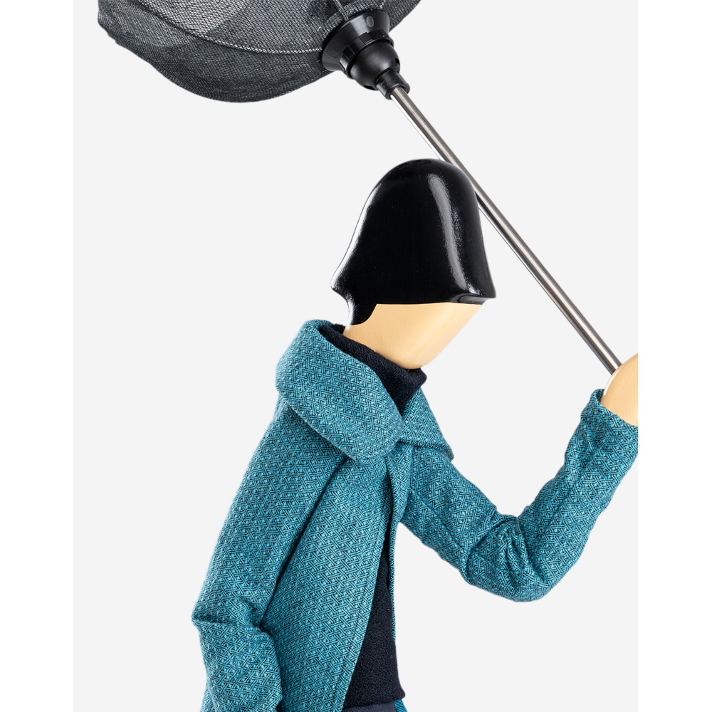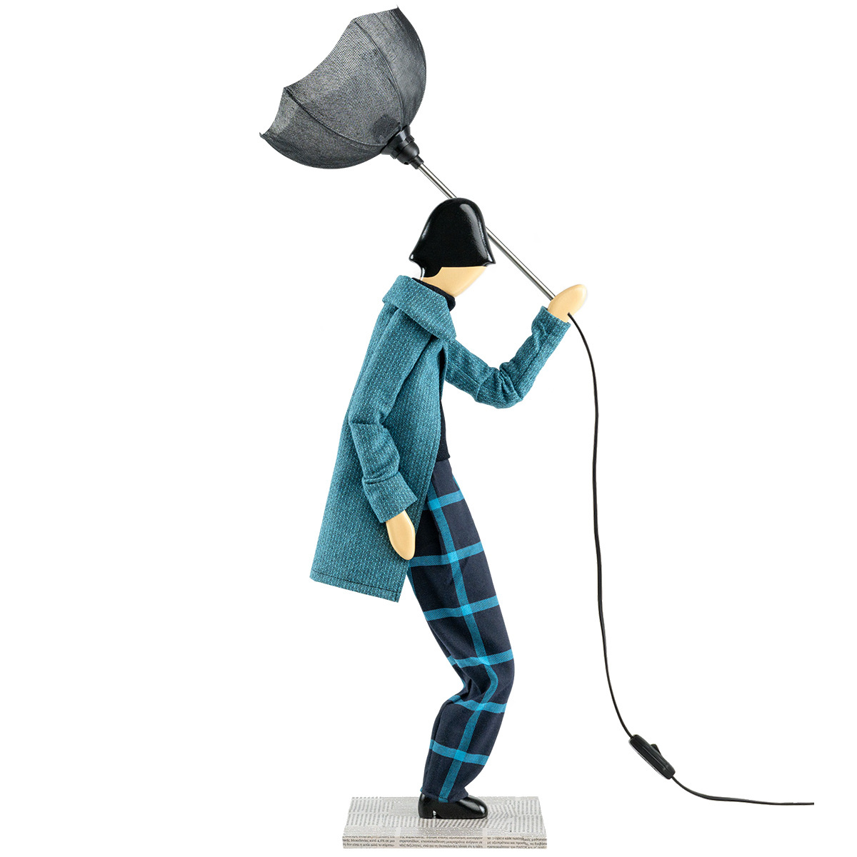 Handgemaakte tafellamp door het Griekse kunstenaarscollectief Skitso uit Thessaloniki. Deze lamp heeft de vorm van een artistieke heer met in zijn hand een paraplu. Aan de omgeklapte paraplu, de open gewaaide jas en de houding van de man, zie je dat er een flinke tegenwind staat. Maar daar is hij prima tegen opgewassen. Zo trotseert deze trendy heer probleemloos de wind.