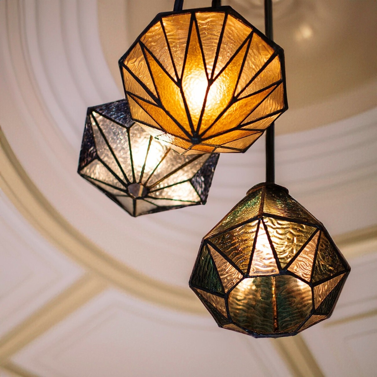 Pittige lijnen in frisse transparante kleuren in combinatie met een vintage linnen snoer vormen een briljant Tiffany hanglampje.