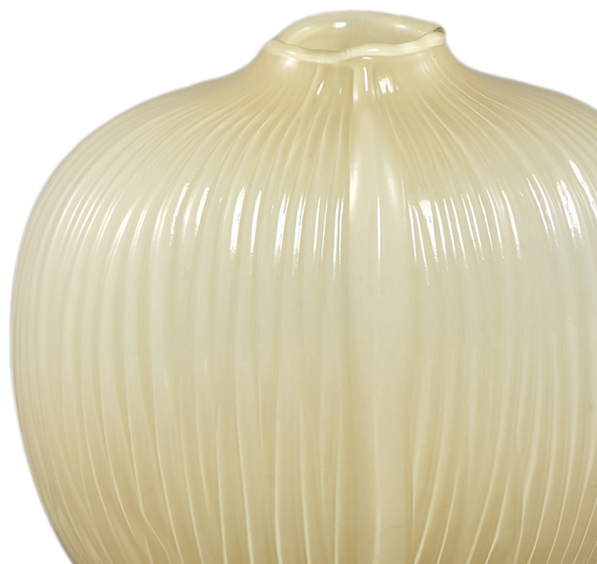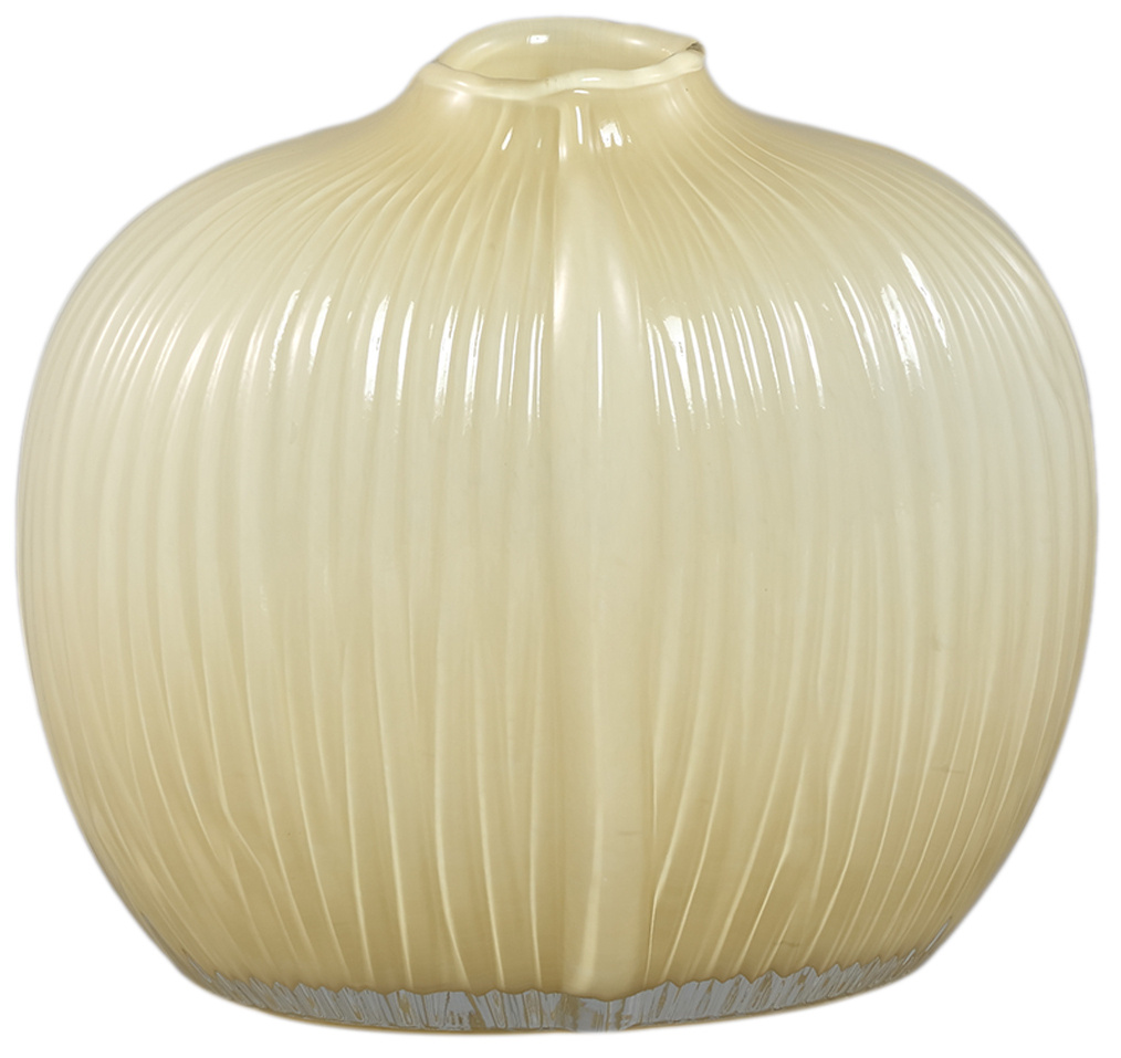 Mooie ovale vaas uitgevoerd in de kleur crème en prachtig gedecoreerd met ribbels rondom de vaas. Elke vaas is een unica, want ze zijn handgemaakt. Deze vaas heeft een moderne uitstraling en staat goed op een tafel of in een vitrinekast. Maar ook als bloemenvaas kan hij dienst doen, dan wel met een passend boeket!