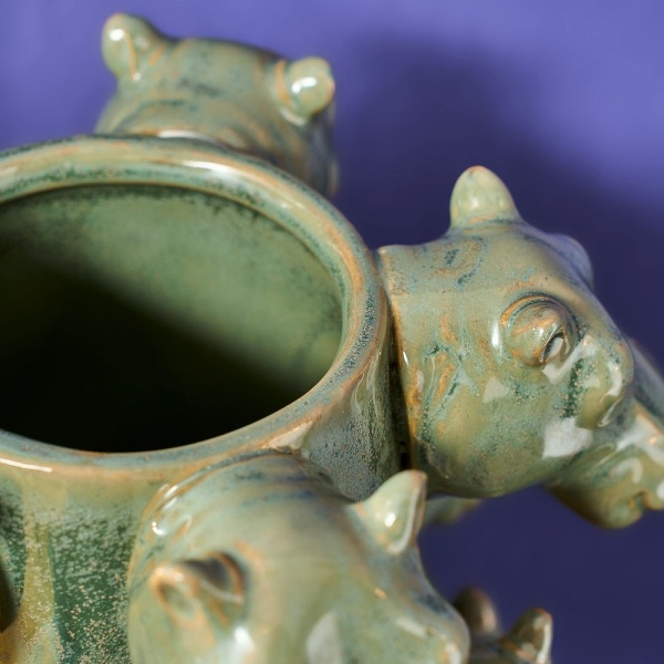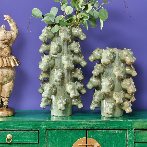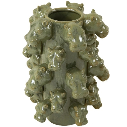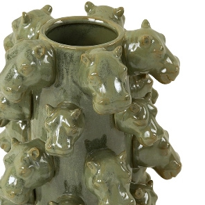 Zeker een mooie aandachttrekker voor op de eettafel of een mooi dressoir. Deze geglazuurde keramieken vaas is gedecoreerd met meerdere nijlpaard hoofden rondom de gehele vaas. Met zijn mooie turquoise kleur staat het erg mooi in een strak interieur maar ook in een kleurrijk interieur springt deze vaas eruit!