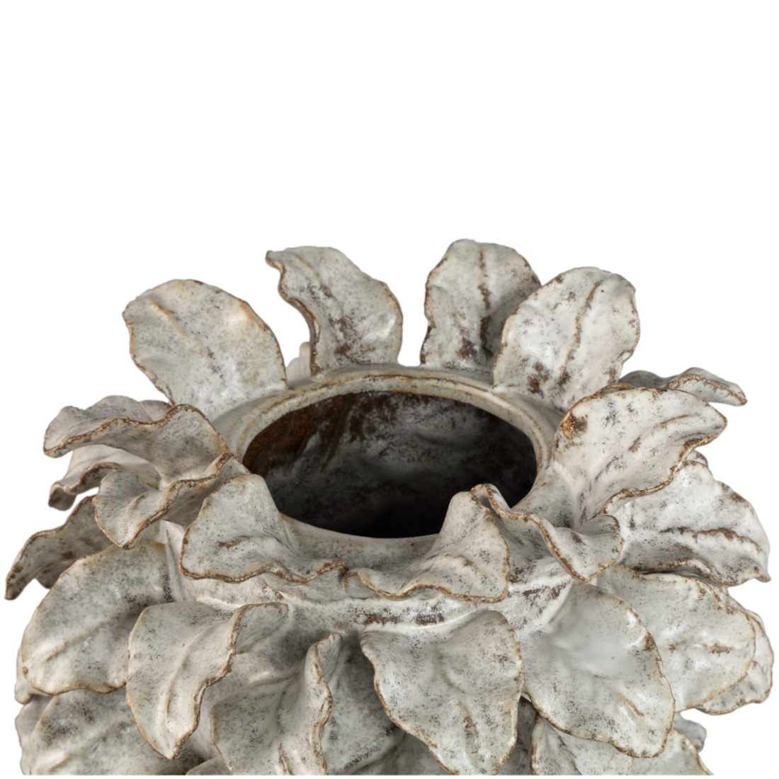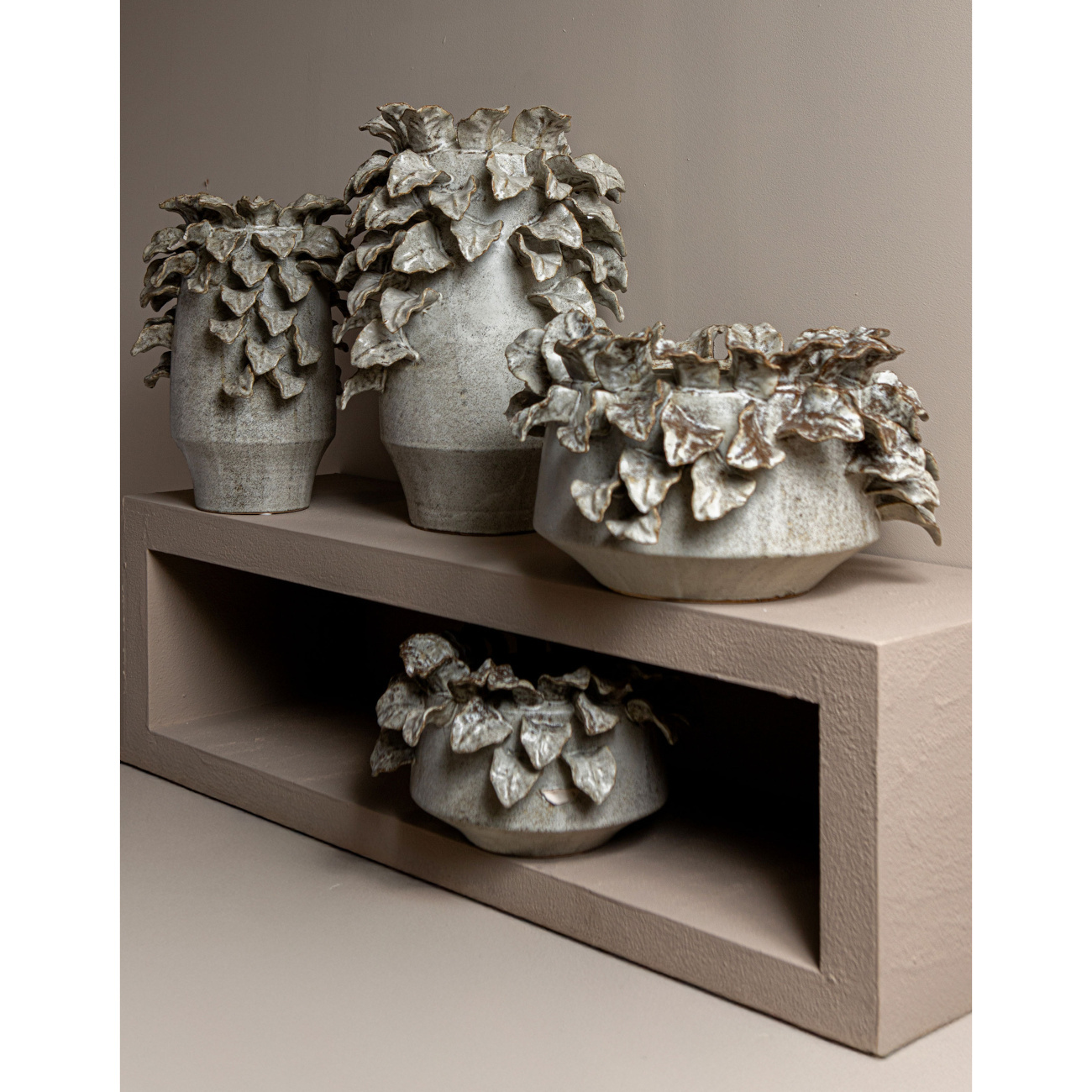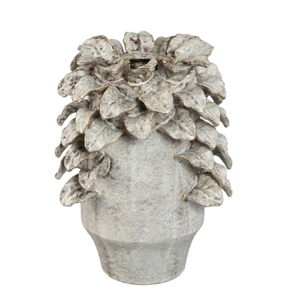 Zeker een mooie aandachttrekker in een open kast of op een dressoir. Deze aardewerk vaas is gedecoreerd met bladeren rondom de gehele vaas. Alle bladeren zijn beige met bruine details. Door de rustige kleur combinatie en het bijzondere model staat het erg mooi in een strak interieur maar ook in een kleurrijk interieur springt deze vaas eruit!