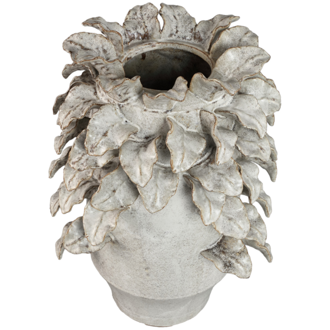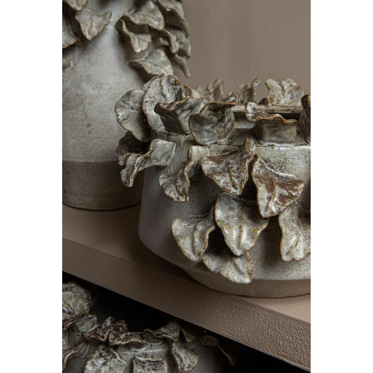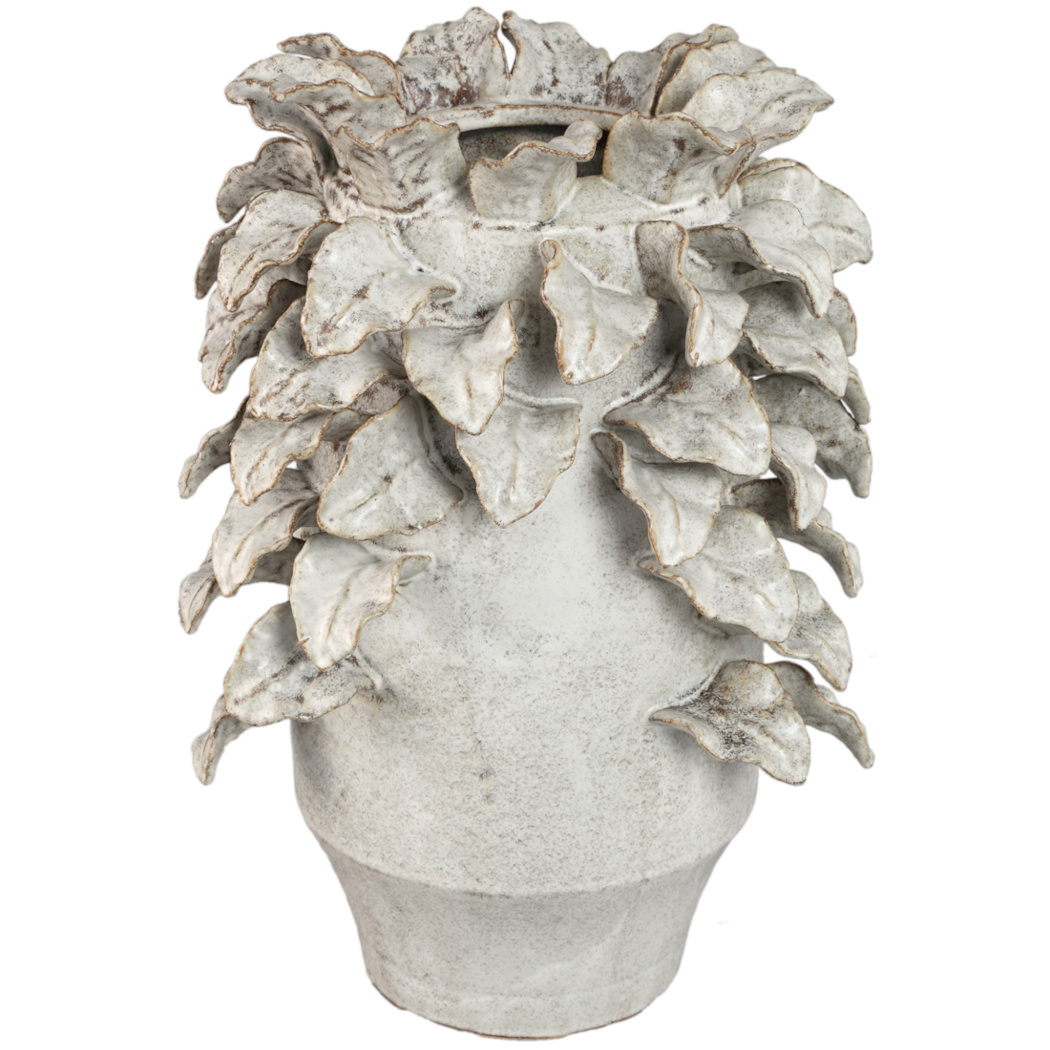 Zeker een mooie aandachttrekker in een open kast of op een dressoir. Deze aardewerk vaas is gedecoreerd met bladeren rondom de gehele vaas. Alle bladeren zijn beige met bruine details. Door de rustige kleur combinatie en het bijzondere model staat het erg mooi in een strak interieur maar ook in een kleurrijk interieur springt deze vaas eruit!