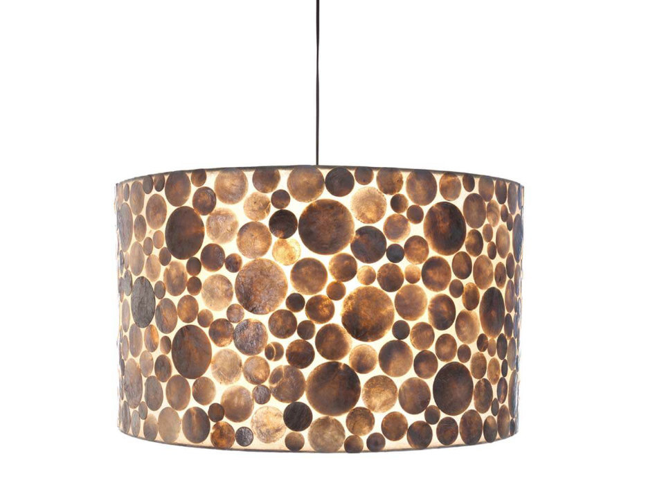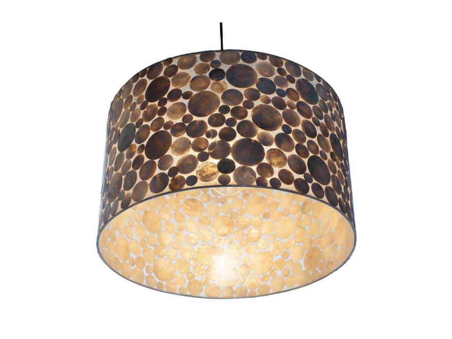 Bij avond verspreiden deze schelpenlampen een warm licht, mede gekleurd door de schelprondjes. Als de lamp uitgeschakeld is weerschijnen de goudkleurige rondjes het aanwezige licht en vormen een speels patroon.