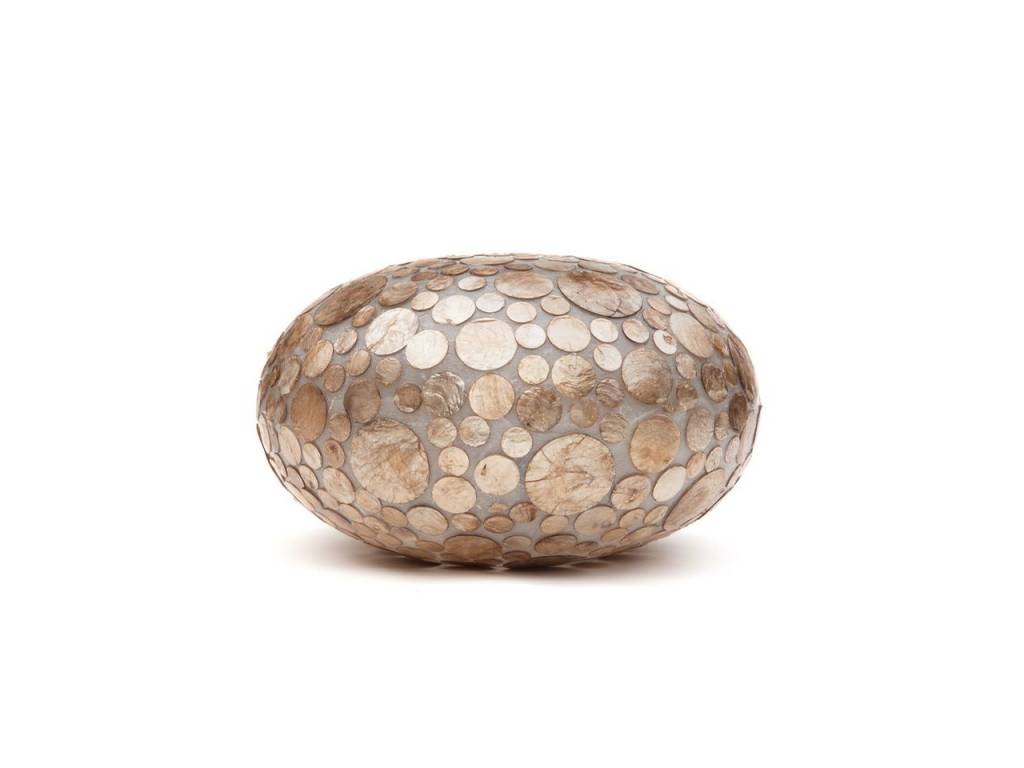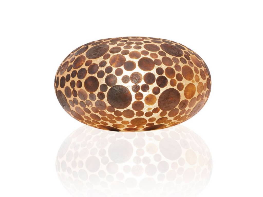 Bij avond verspreiden deze schelpenlampen een warm licht, mede gekleurd door de schelprondjes. Als de lamp uitgeschakeld is weerschijnen de goudkleurige rondjes het aanwezige licht en vormen een speels patroon.