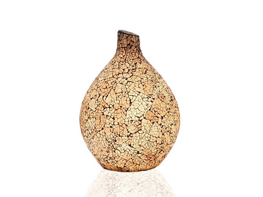 Als de lamp uitstaat overheerst de glans van de glasstukjes, naarmate de lamp door het daglicht of andere lampen wordt aangelicht.