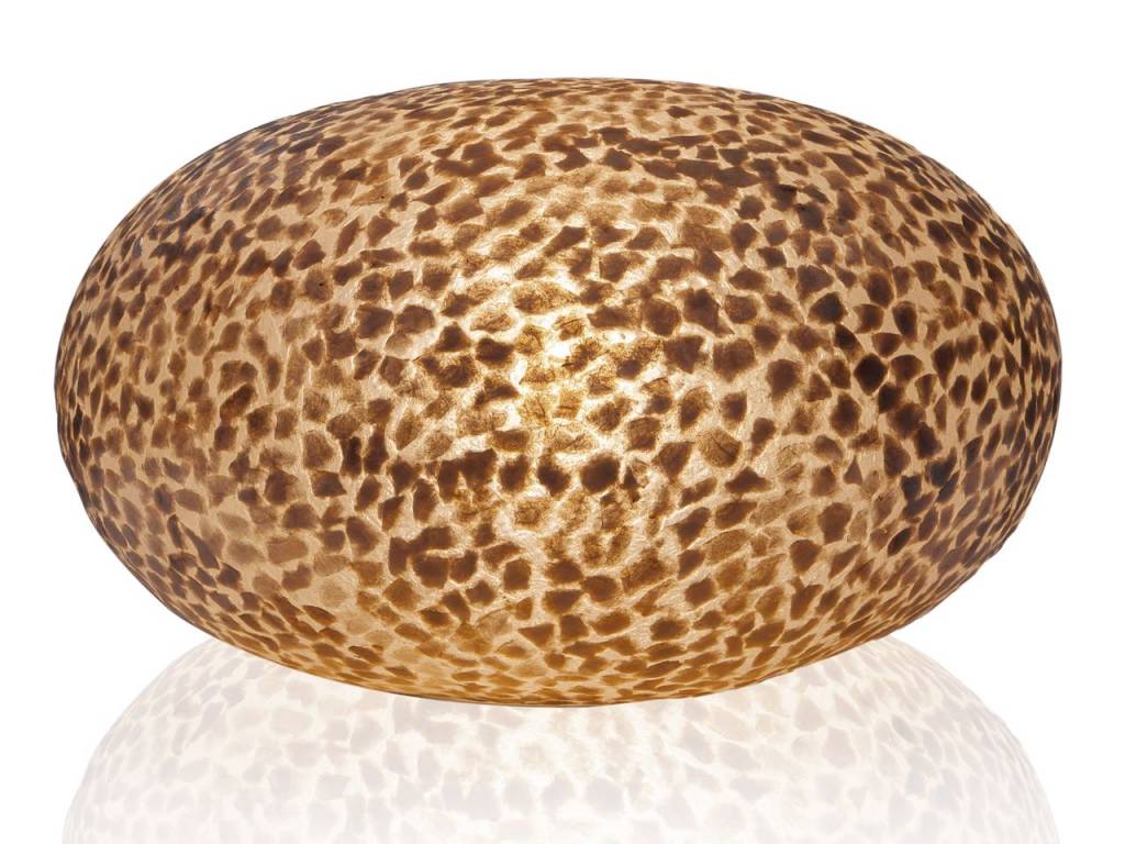 Uitgeschakeld overheerst de goudkleurige weerschijn van de schelpdeeltjes.