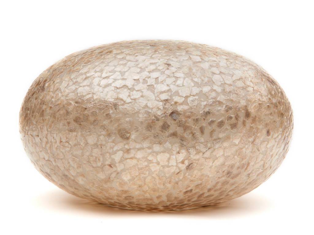 Alle lampen in de Wangi-serie hebben een fiberglas vorm als basis en zijn na het beplakken met parelmoer-fragmenten afgewerkt met een blanke lak.