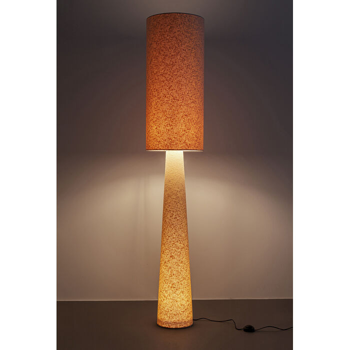 Deze opvallend volledig gestoffeerde vloerlamp in een retrolook is een sfeermaker voor in je huis. Zijn zachte uitstraling brengt warmte en gezelligheid in je interieur. De volledige lamp geeft licht doordat er een fitting onderin de voet en onderin de kap zit. Beiden gaan tegelijk aan met een aan/uit schakelaar in het snoer verwerkt. Draadlengte van dit snoer is 250 cm.