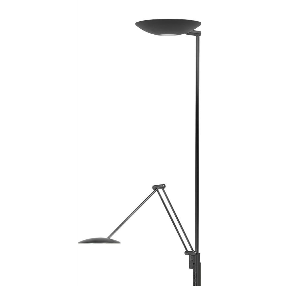 Bijzondere uplighter met verstelbare leesarm uitgevoerd in mat zwart poedercoating. De bovenste lichtschaal heeft een ronde, met glas bedekte opening aan de onderzijde voor nog meer lichtopbrengst. Zowel de uplighter als de leesarm, zijn afzonderlijk van elkaar, dimbaar.