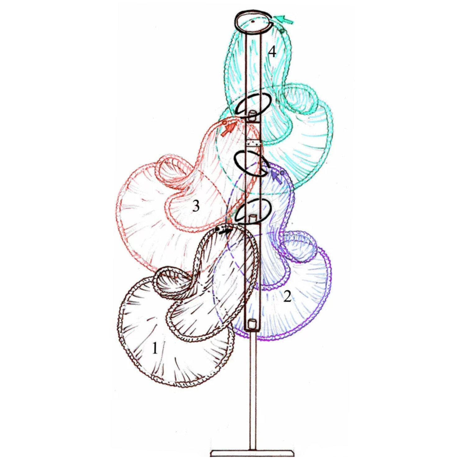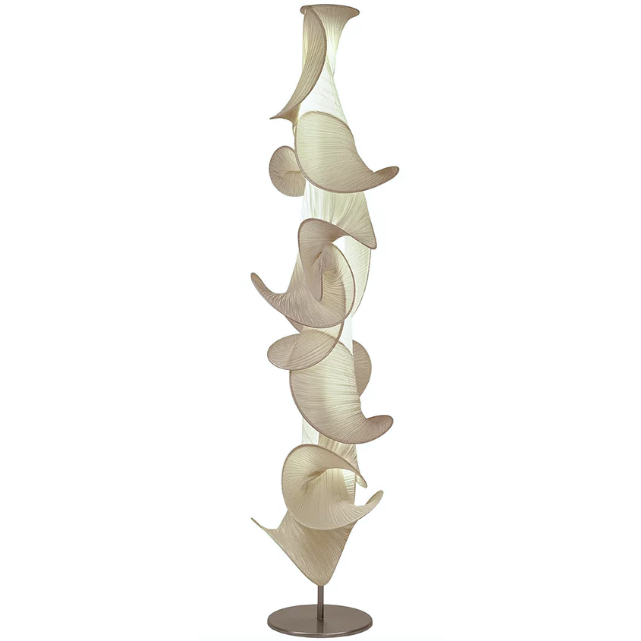 Vloerlamp Nymph ontworpen door de Griekse ontwerpster Alexandra Tsoukala. Een sierlijke lamp met een zachte satijnen polyester stof. Deze stof is op vier punten van de lamp rondom te bevestigen waardoor het mooi om de lamp heen beweegt. De stof is te wassen. Haal de 2 stoffen van de lamp af en was deze met de hand, met koud water en zeep.