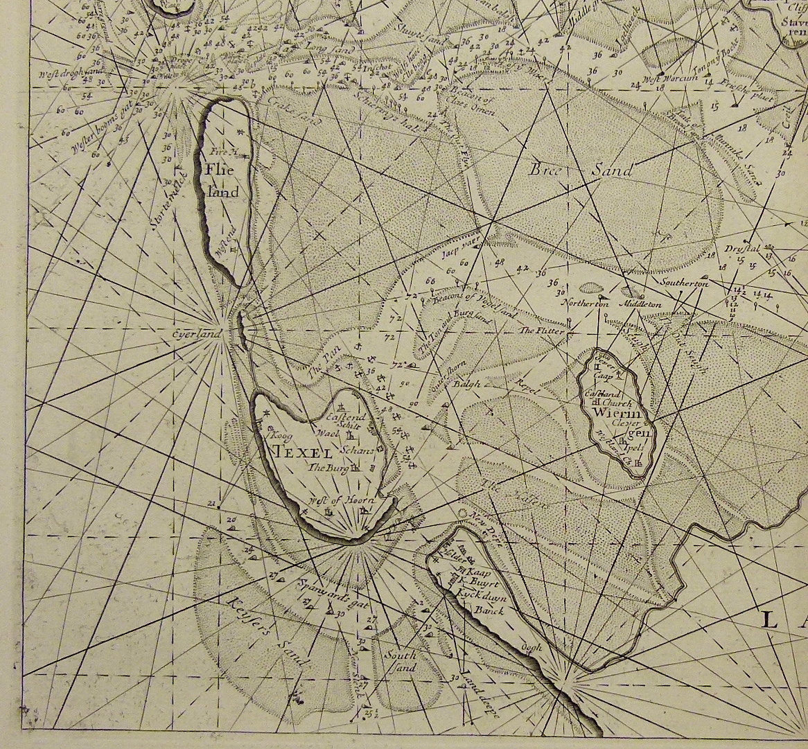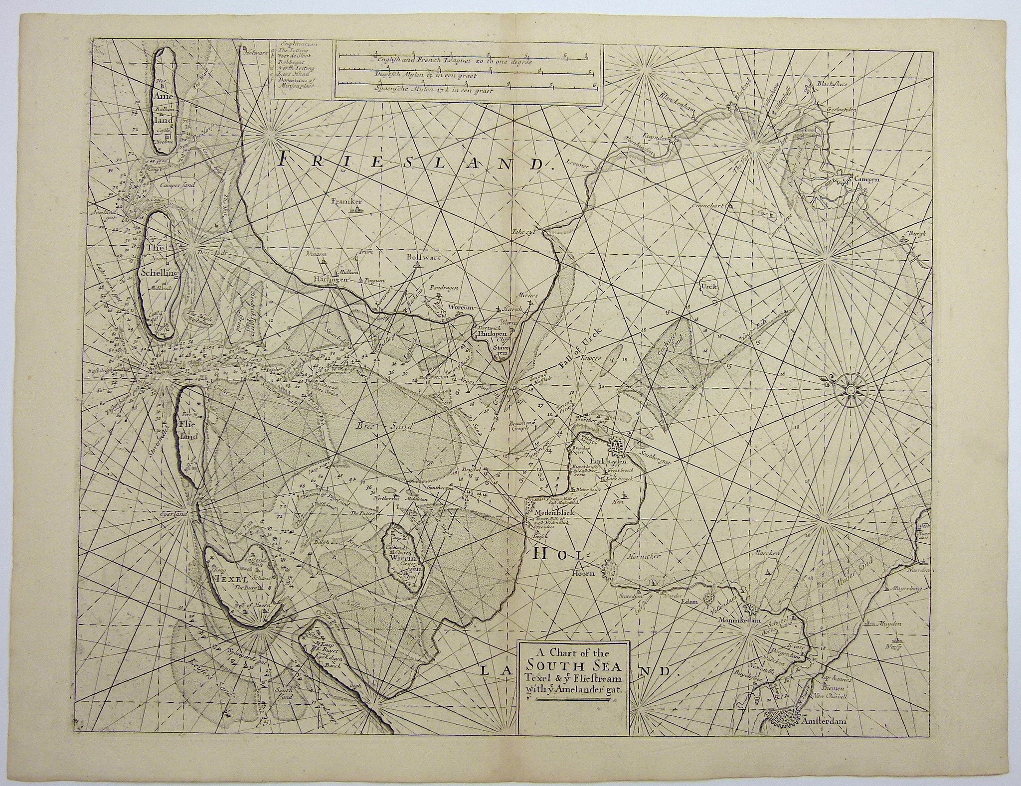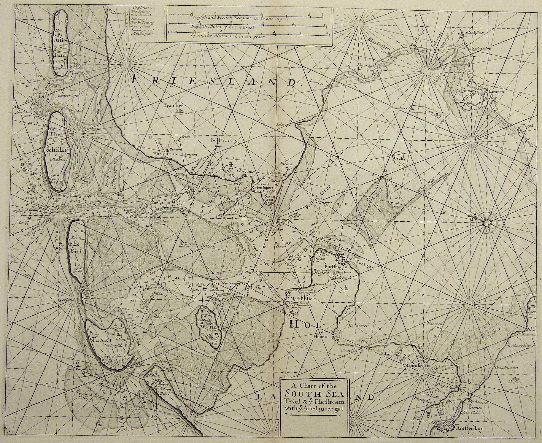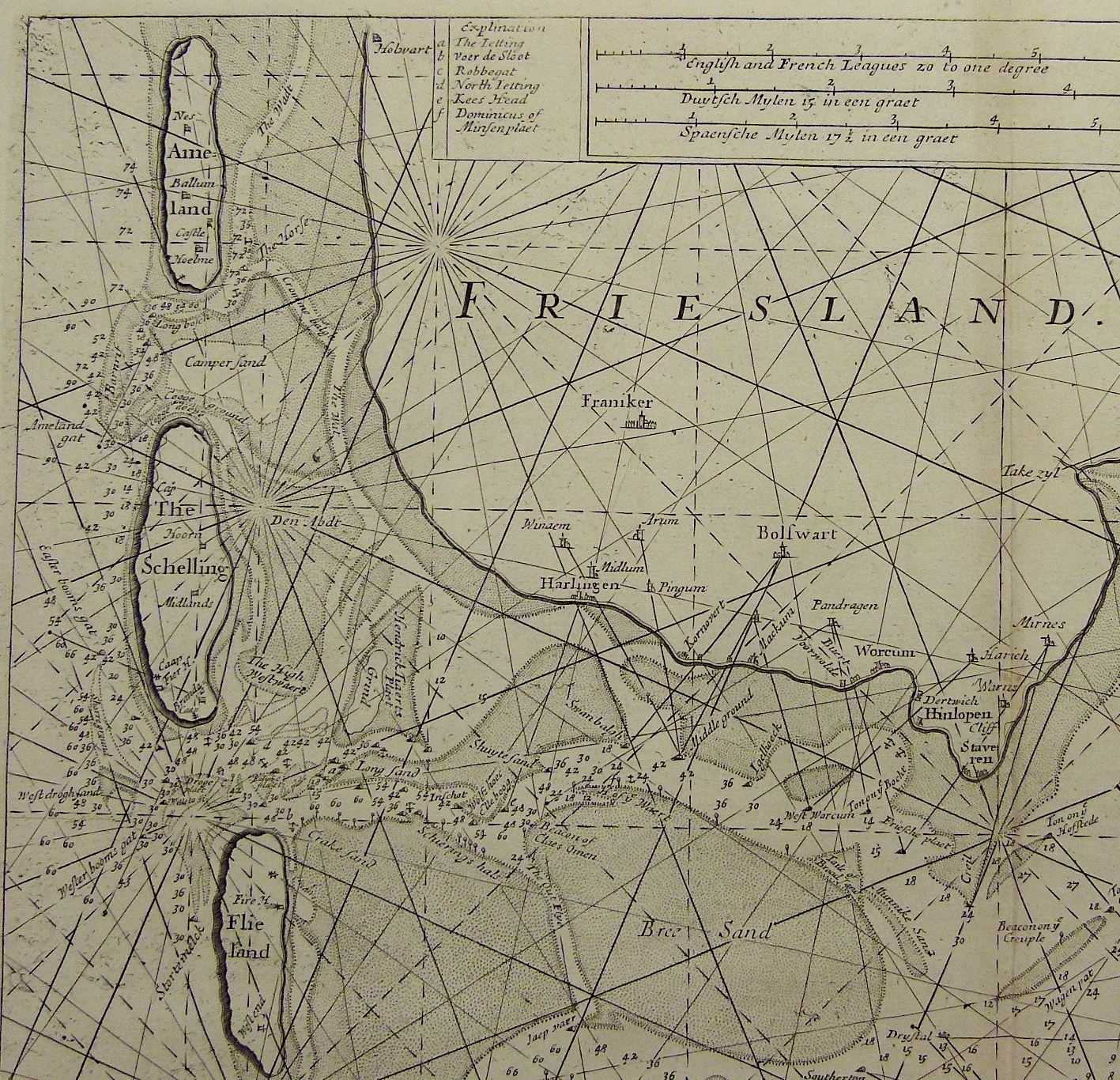Met de kustlijn van Friesland, Holland en Overijssel en de waddeneilanden Ameland, Terschelling, Vlieland, Texel en de eilanden Wieringen en Urk. Met schaalverdeling, kompasroos, koerslijnen en opvallend gedetailleerde weergave van dieptematen en zandbanken.